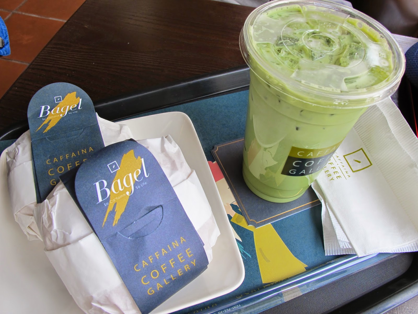 來找午餐的我們,簡單的嘗試了兩種貝果,事先做好的貝果,會再加熱後出餐。抹茶喝起來味道跟星巴克得幾乎一模一樣。