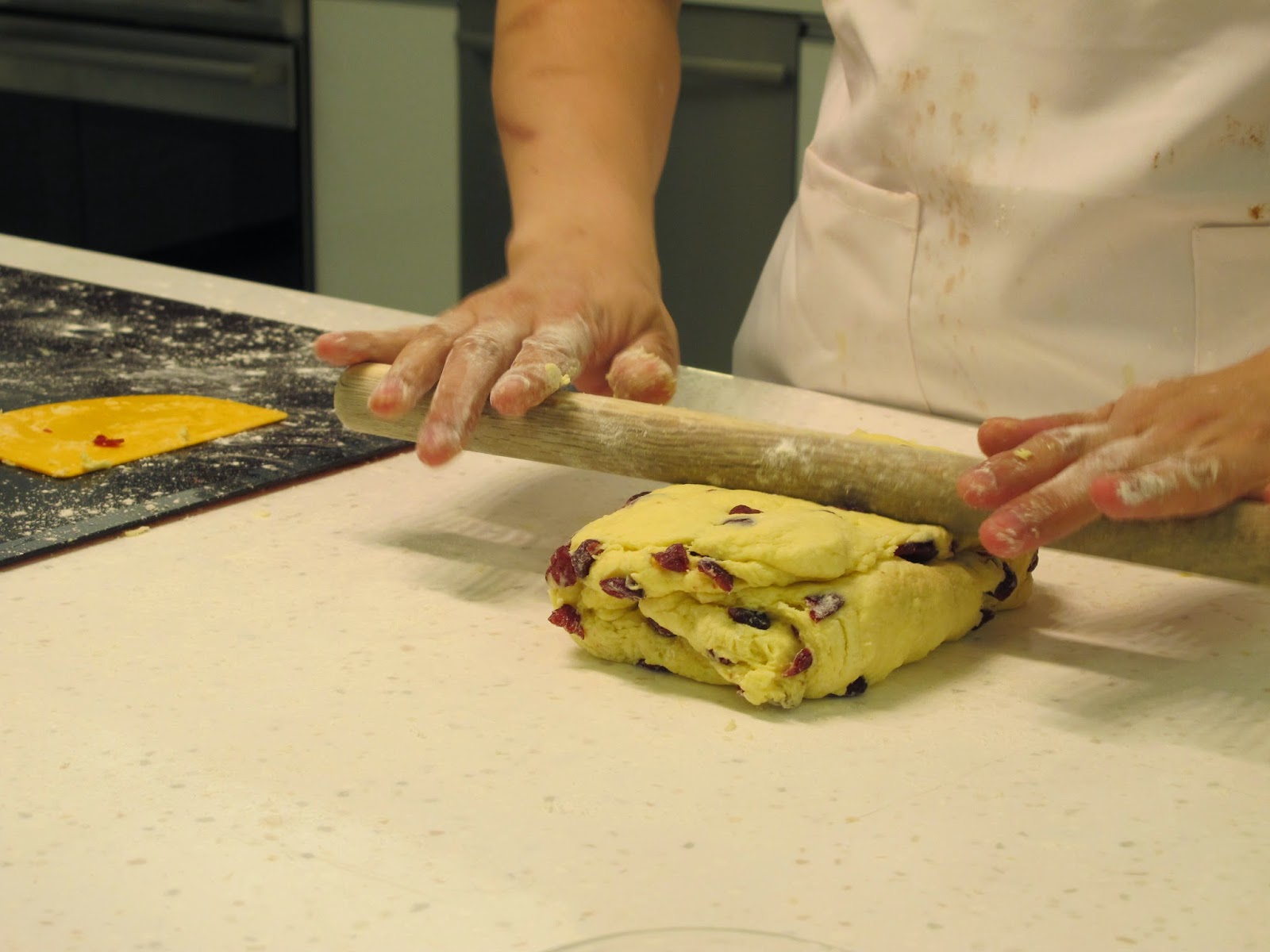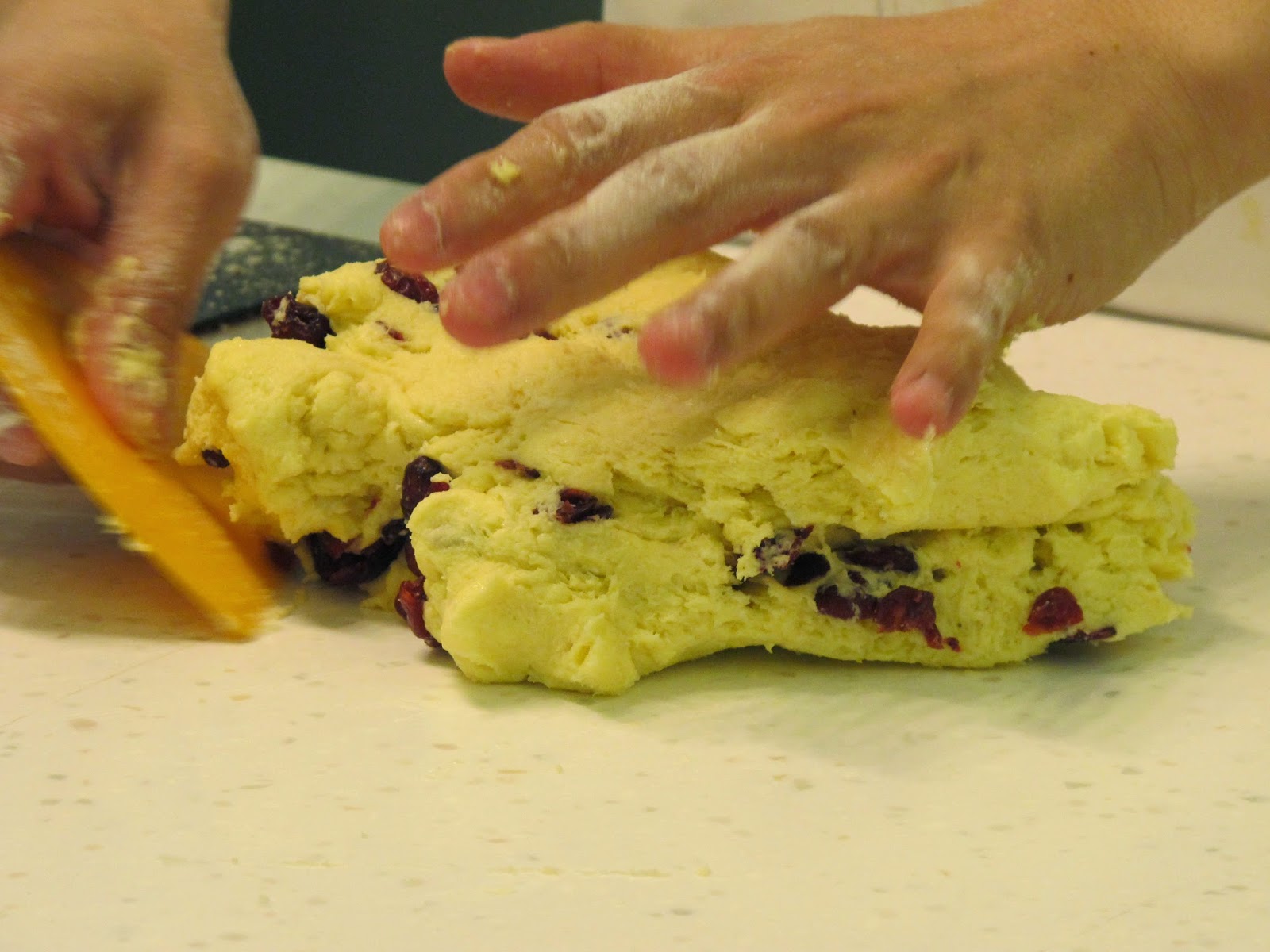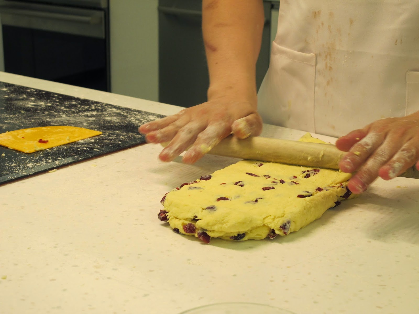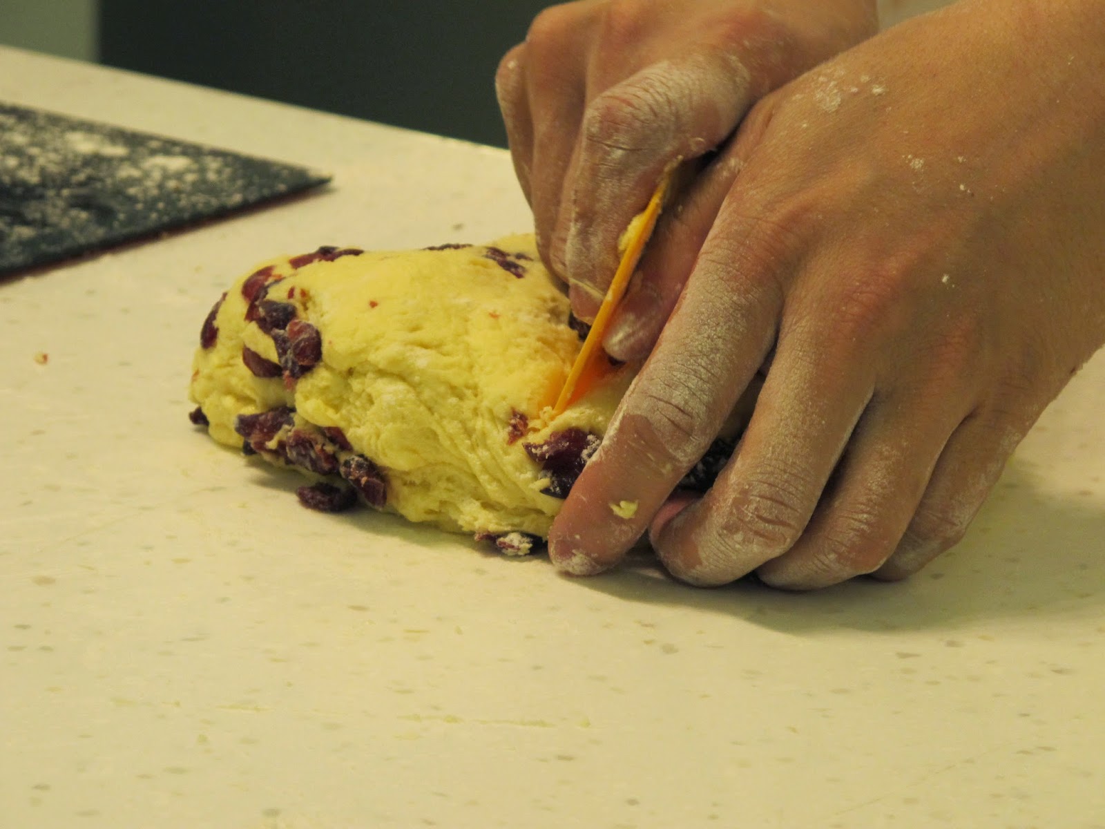 加入蔓越莓果乾的司康,色澤非常的優雅。在一切一壓中,司康的口感就這樣形成了!覺得好神奇!