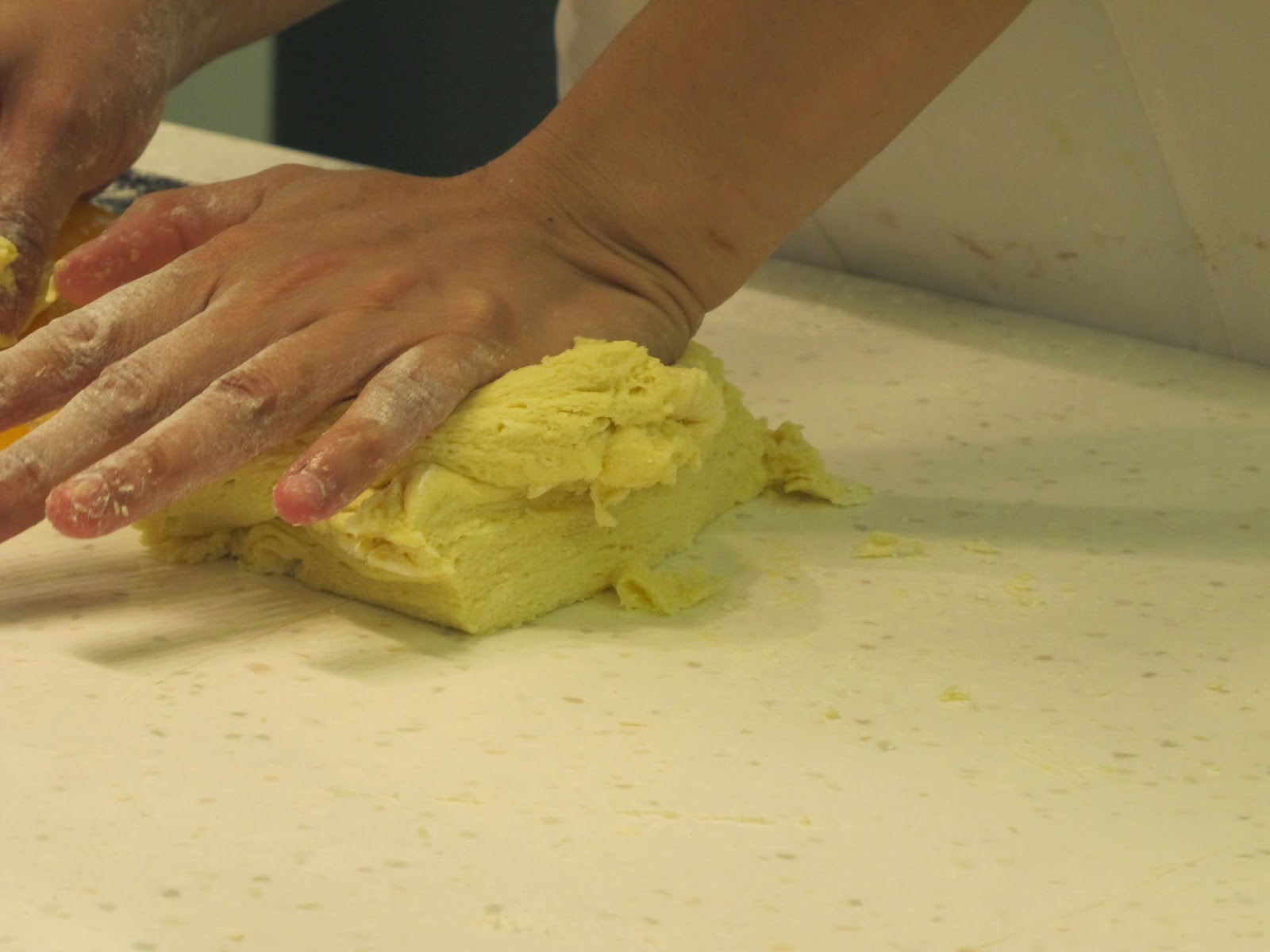 最後再將司康摺疊成三層後,滾成平坦的方塊狀,分切成小三角型,然後再上層塗上蛋液,進烤箱烘焙,不一會兒金黃酥脆的司康,就出爐了!