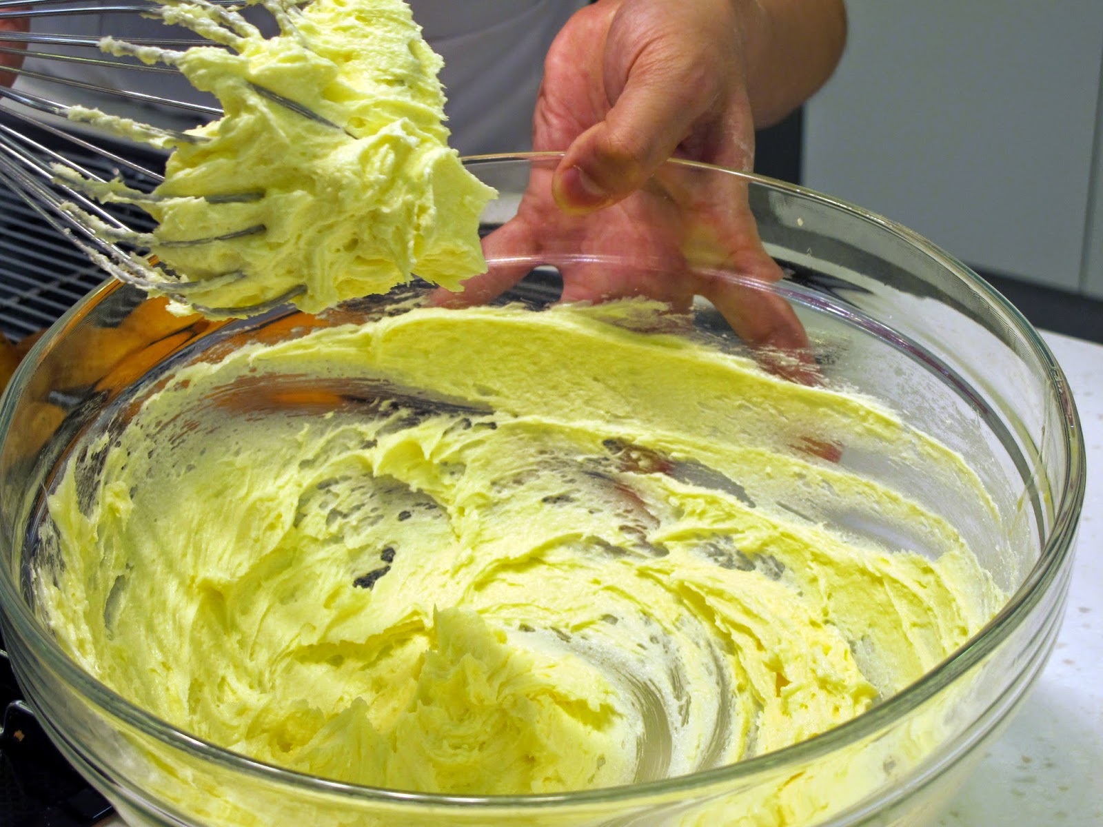 老師首先示範的是需要花較多時間烘焙的水果磅蛋糕,由於顧慮到不是人人家裡都有攪拌機,老師直接示範手工將這份蛋糕完成,真的太符合我的需求了,我就是那個沒有攪拌器,只能用手工打蛋白到硬性發泡,努力做出舒芙蕾,刻苦耐勞的學生。