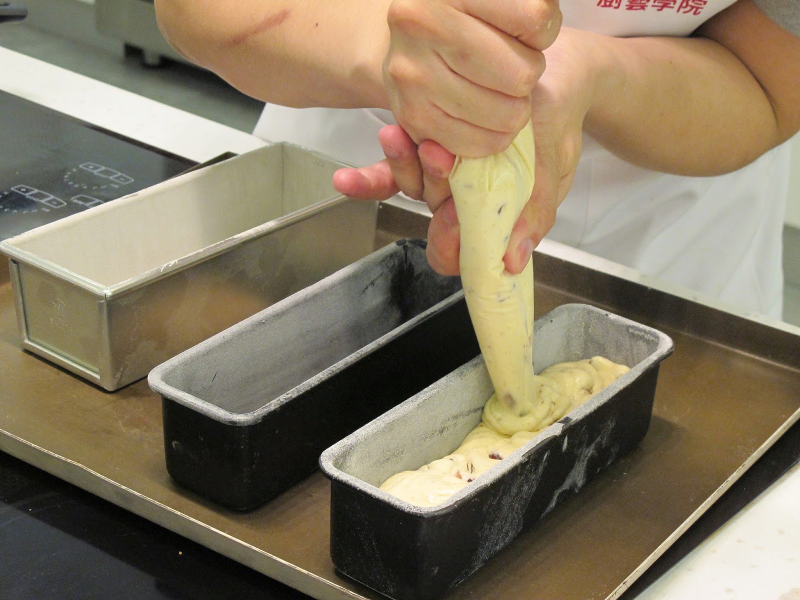蛋糕模型要先抹奶油灑上麵粉,待麵糊加入酒漬水果後,用擠花袋均勻擠入方形蛋糕模型中。