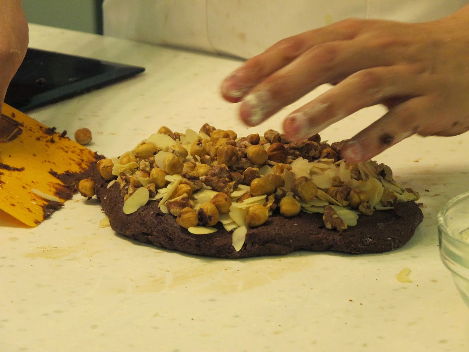 這時老師開始做堅果巧克力沙布列,這是塑型餅乾的一種,老師一樣手工示範,將冰過的奶油與粉性材料一起在碗裡切碎混合,直至奶油非常細密的與粉材結合,才算完成第一步驟。