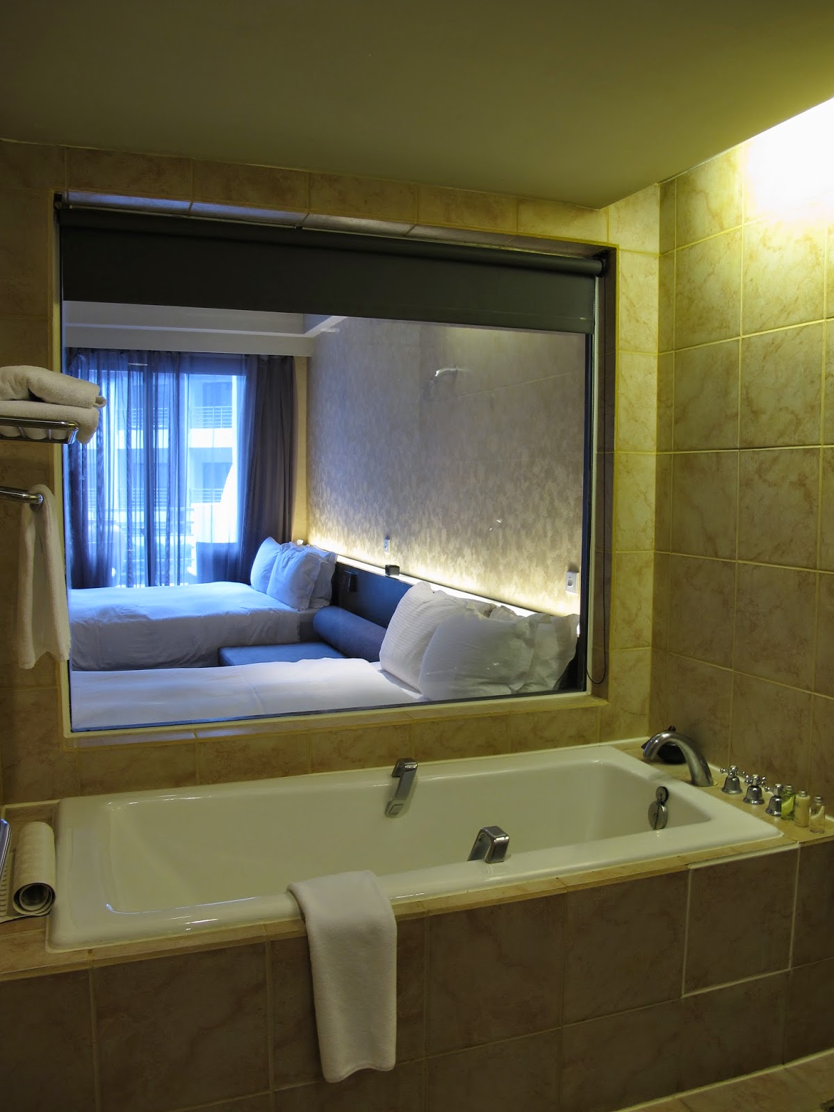 半小時後,我們就進到客房,這次飯店為我們升等兩小床為兩中床,原本是四人房的山嵐客房,只有兩個人住感覺更大了,面對中庭的方向,推開紗窗有個很大的陽台,讓人坐在戶外曬太陽,享受舒心閒情。
