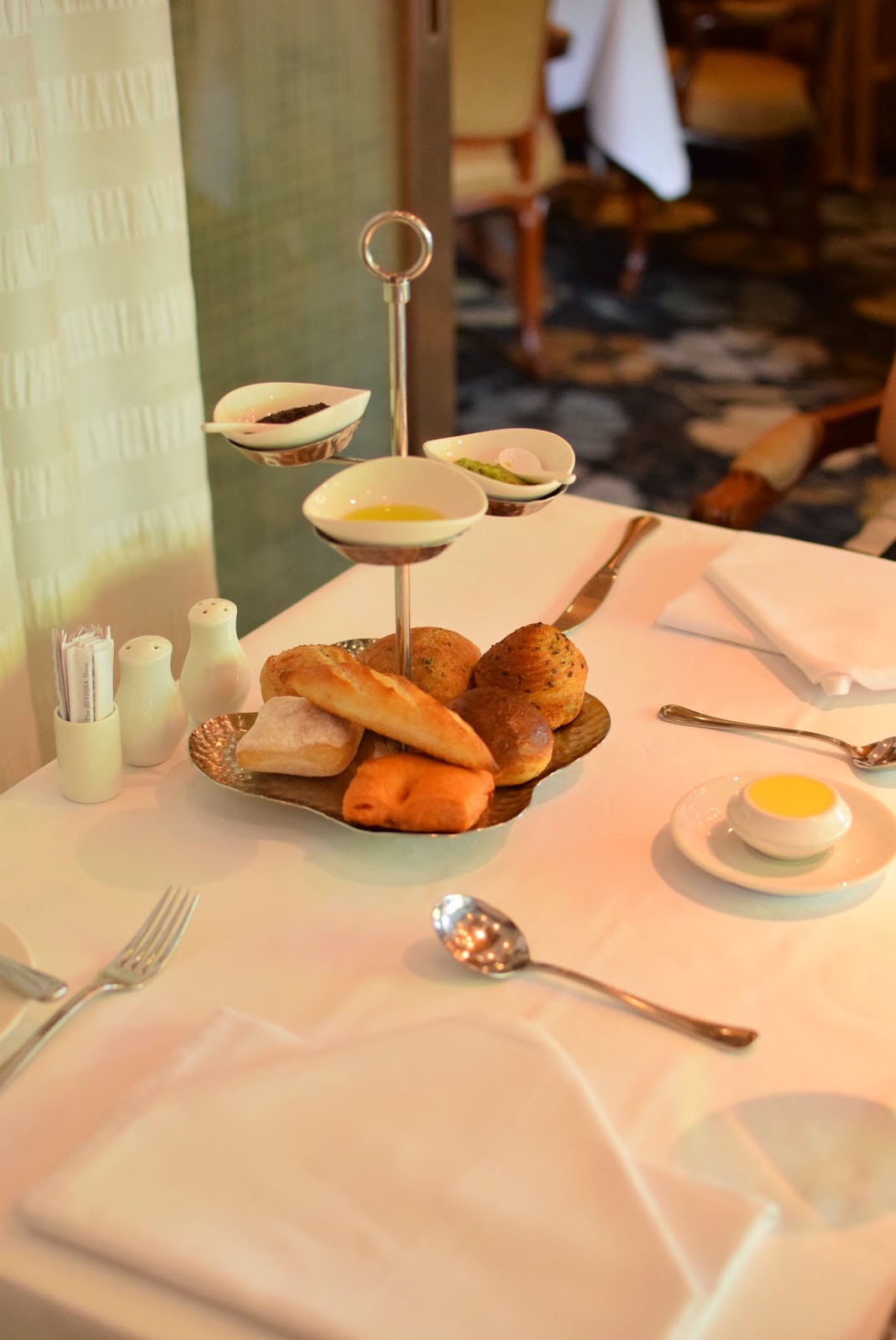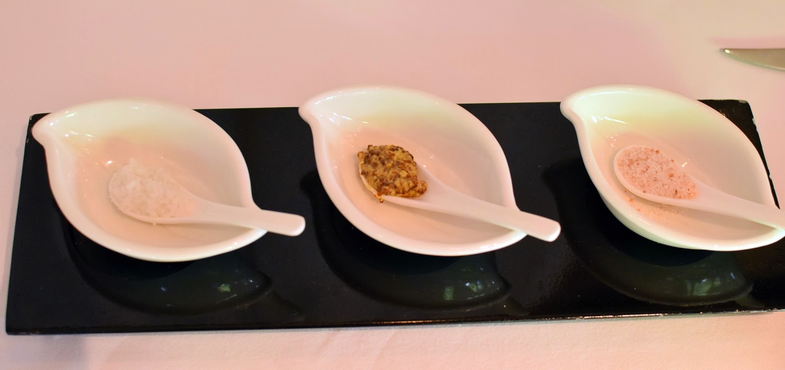 侍者在桌間往返,優雅、專業而有效率。時而親切的整理桌面、時而調整餐具,為下一道菜準備,態度非常的專業! 搭配牛排的鹽之花、玫瑰岩鹽與法式芥末籽醬率先上桌!