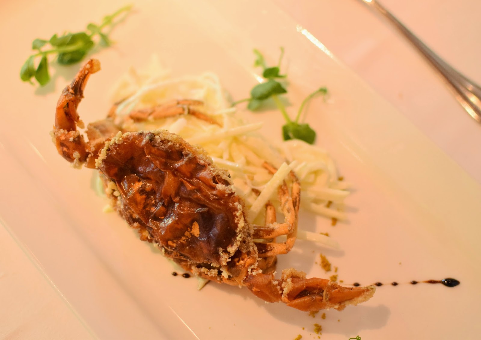 酥炸軟殼蟹炸得恰到好處的酥香薄脆,一咬下去軟殼蟹的鮮味與薄酥的口感在嘴裡同時迸開,味道極好!搭配底下襯著的甜脆的蘋果與大根,適時平衡了油炸物的口感。