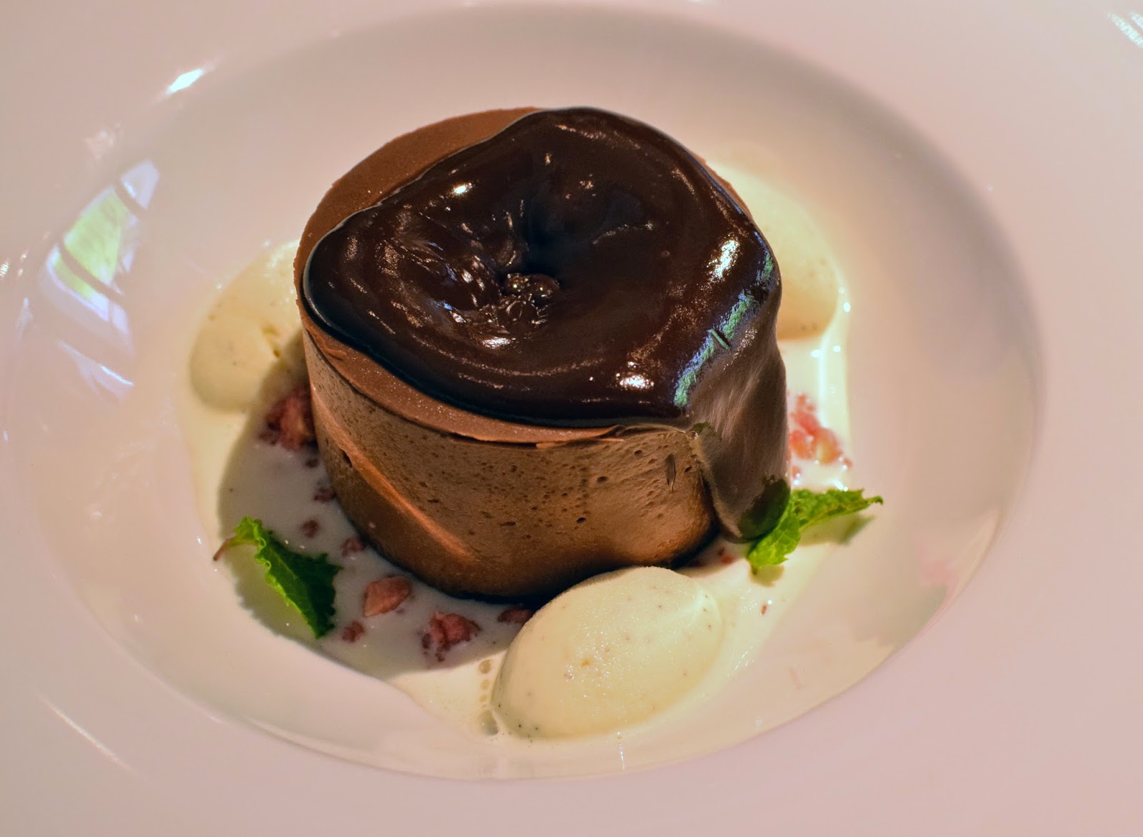 非常特別的八層風味巧克力塔,上桌時侍者會現場淋上熱甘納許巧克力醬,這時驚奇的畫面出現了! 原本平滑的巧克力蛋糕中心,瞬間出現一個凹洞,甘納許醬汁與蛋糕融為一體,裡面層層的巧克力與莓果醬搭配得諧和勻稱,濃郁的黑巧克力再配上一口周圍的冰淇淋,甜度正好。