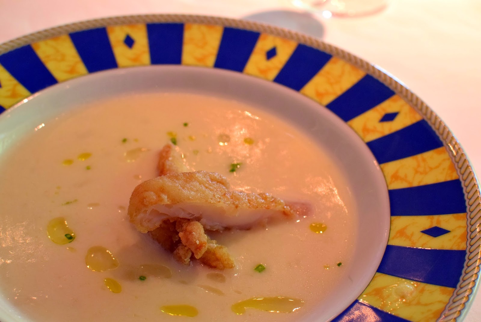 這盤華麗的奶油洋蔥濃湯,搭配上炸魚片再滴上些許松露油,吃得到奶油與麵粉燉煮出來的濃湯口感,松露油風味獨特,而魚片炸得柔軟順口,與濃湯豐富濃厚的質地非常合拍!