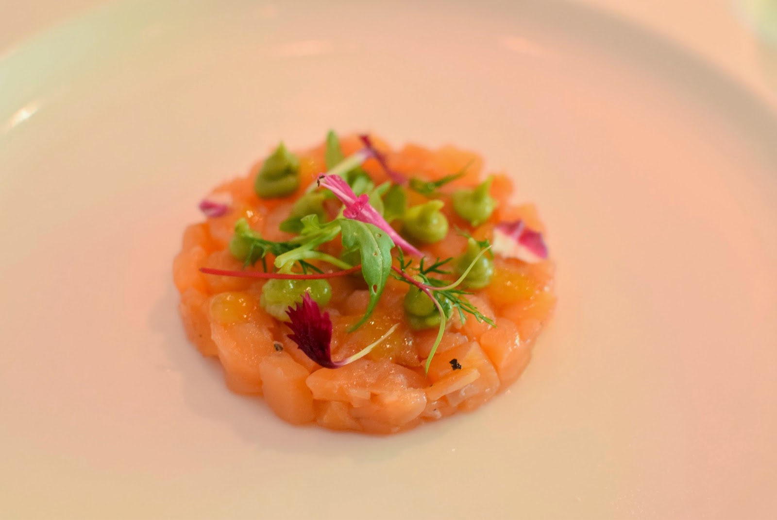 前菜有六種選擇,天氣稍熱我喜歡吃冷前菜,燻鮭魚塔塔正合我口味!燻鮭魚肉嚐起來煙燻味不重,酪梨醬、檸檬泥的水果與香甜提升了魚肉的鮮美滋味,嚐起來微涼的魚肉吃得到一小塊一小塊的口感,點綴的食用花不但讓這道菜在視覺上增色不少,也增進自然的香甜風味!