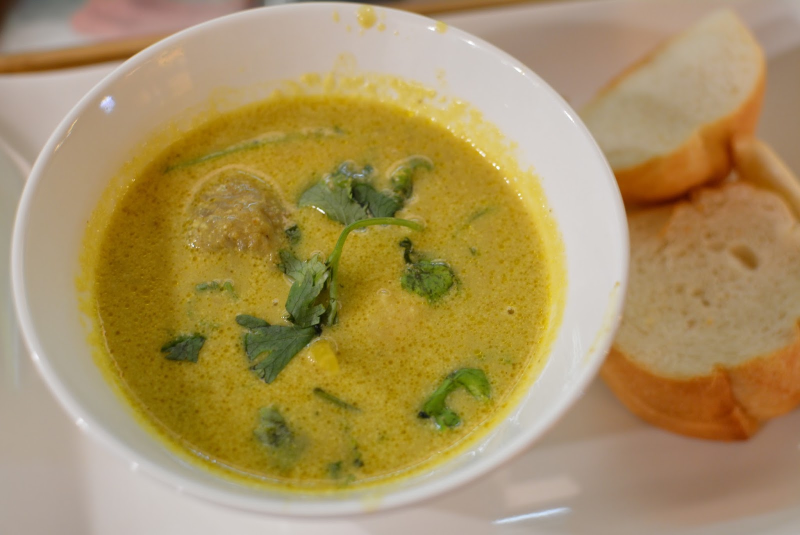 越式椰漿咖哩雞滿是椰漿濃厚的滋味與放山雞的鮮美交融成這碗濃滑的雞湯,湯底也是以香茅熬煮而成,另外再放入甲仙的芋頭,芋頭的口感綿軟濕潤,吸飽咖哩雞湯,非常綿密好吃。