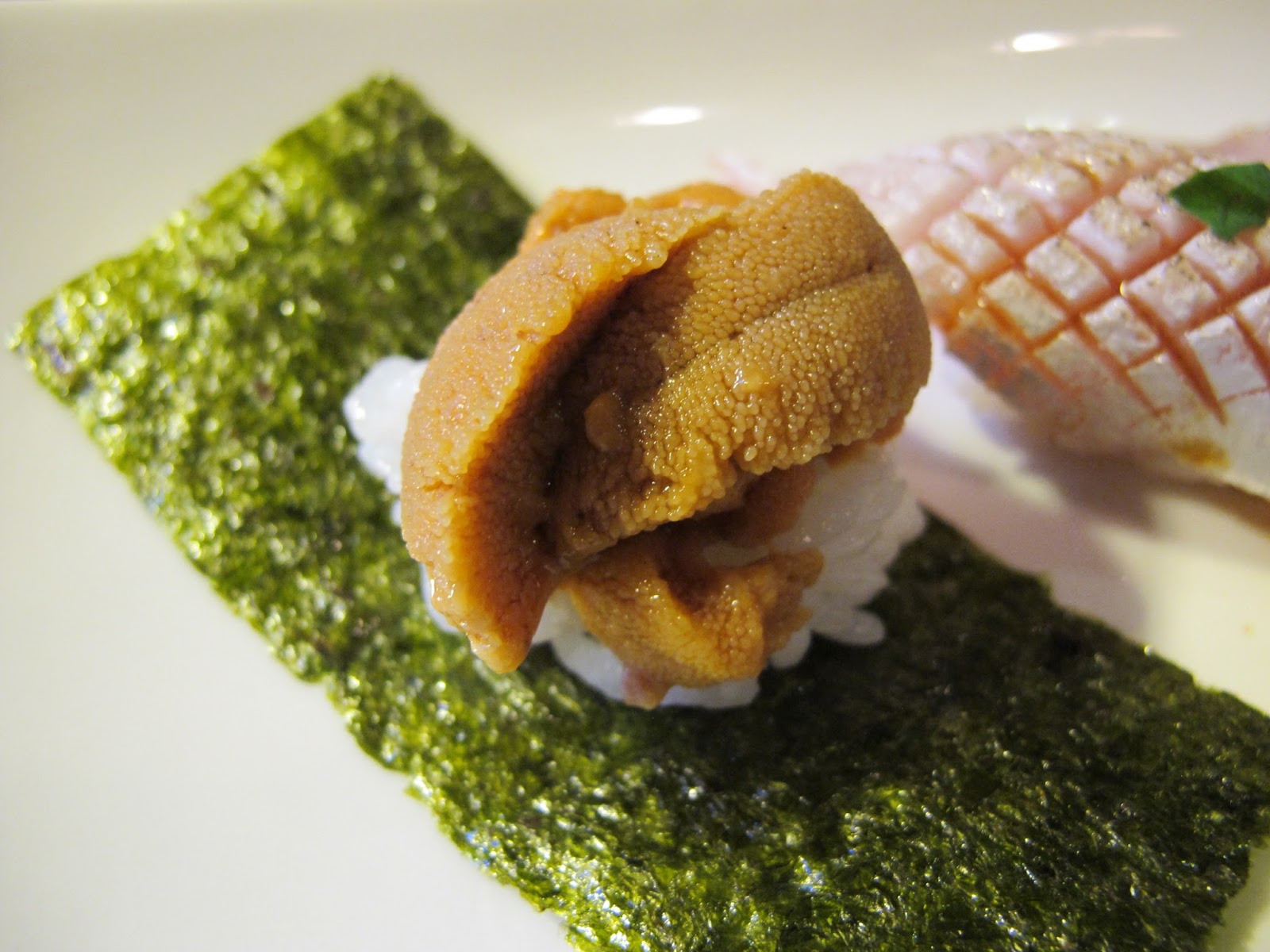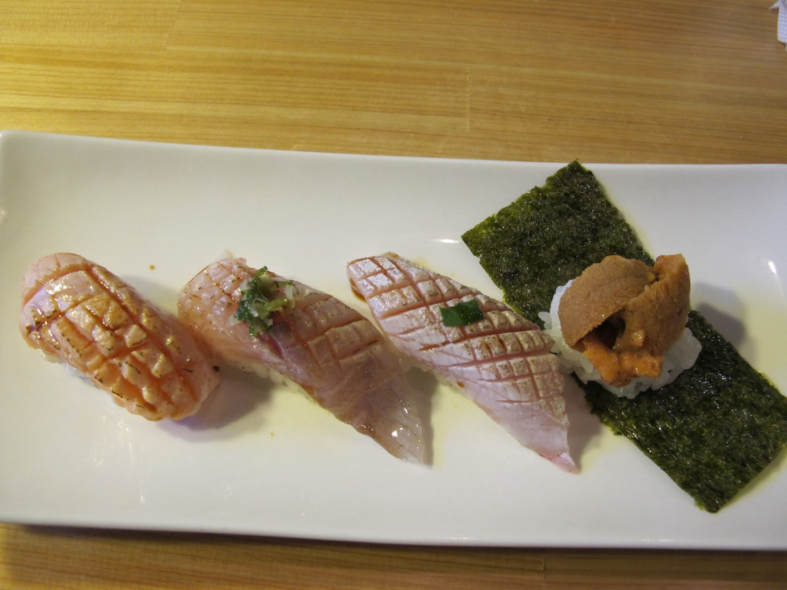 緊接著又上來四款令人驚豔的握壽司,每款都展現出師傅的刀功,菱格紋的生魚片在經過炙烤,表面的魚肉漂亮地綻開,油脂香氣豐盈,海膽更是甜嫩無比,成為這份握壽司中的亮點。