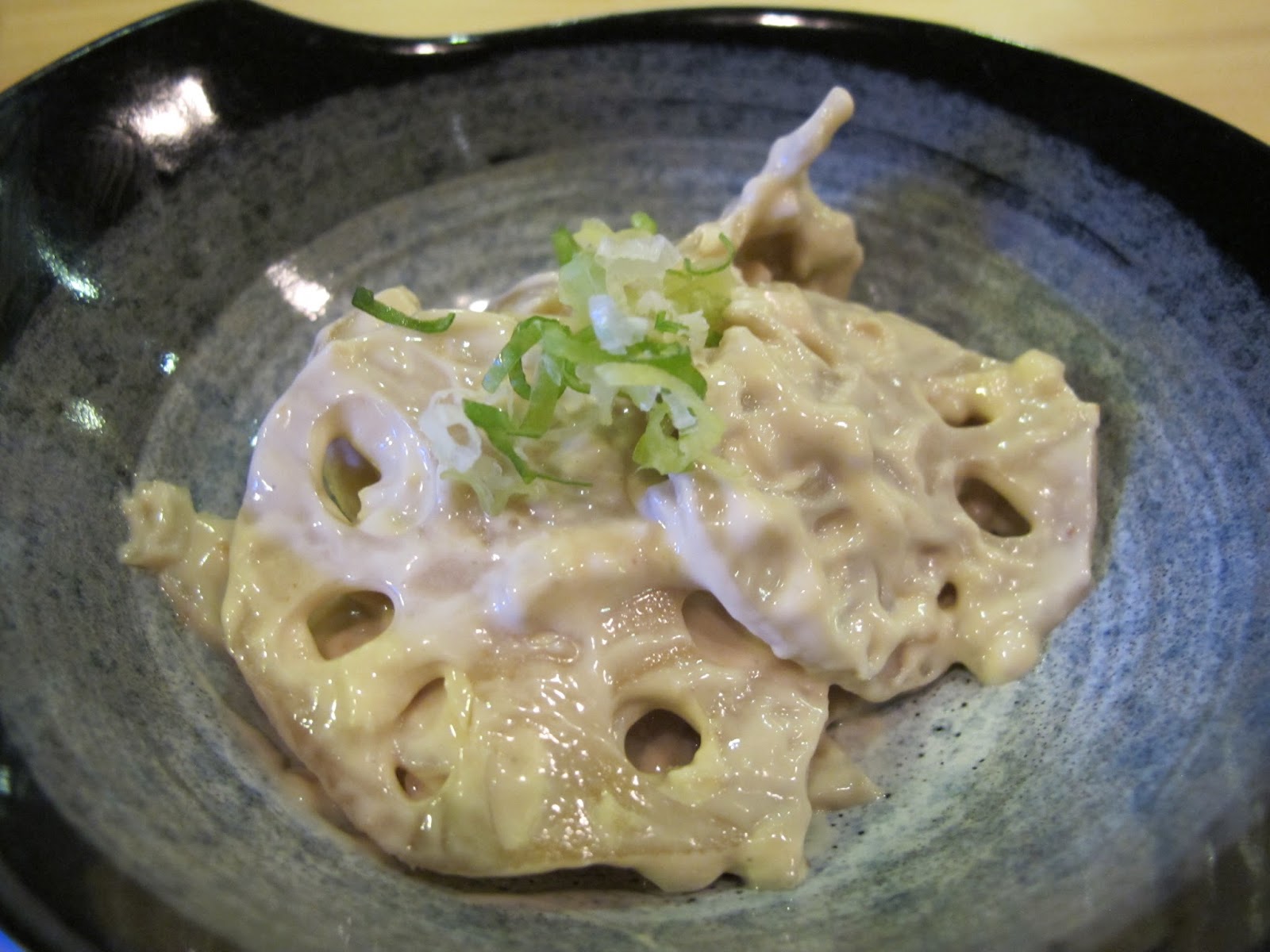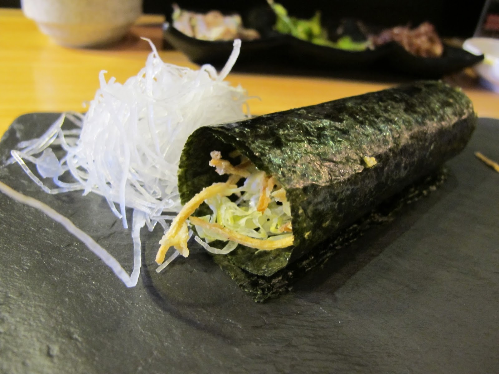 率先上桌的是冷前菜和牛蒡手捲,牛蒡絲炸得酥脆捲入海苔捲中,伴著鮮脆的蔬菜,吃起來非常爽口!