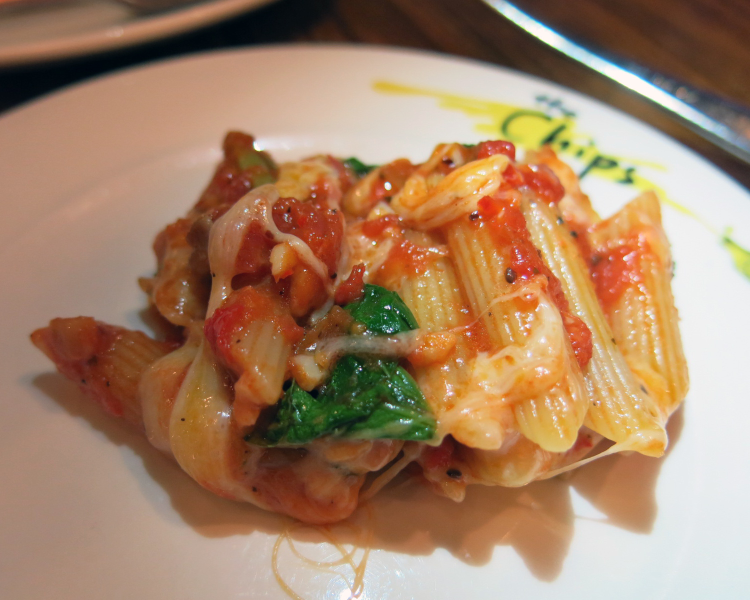 辣味雞肉尖管麵一上桌立刻被融化的起司吸引住,原來這是一道焗烤麵,香濃可口的起司一拉起來就是拔絲,更加令人垂涎,鋪底的蕃茄辣醬只有微辣,大家應該都敢吃,雞腿肉的雞丁切得蠻大塊,但只有五塊左右,覺得很好吃數量卻有點少。