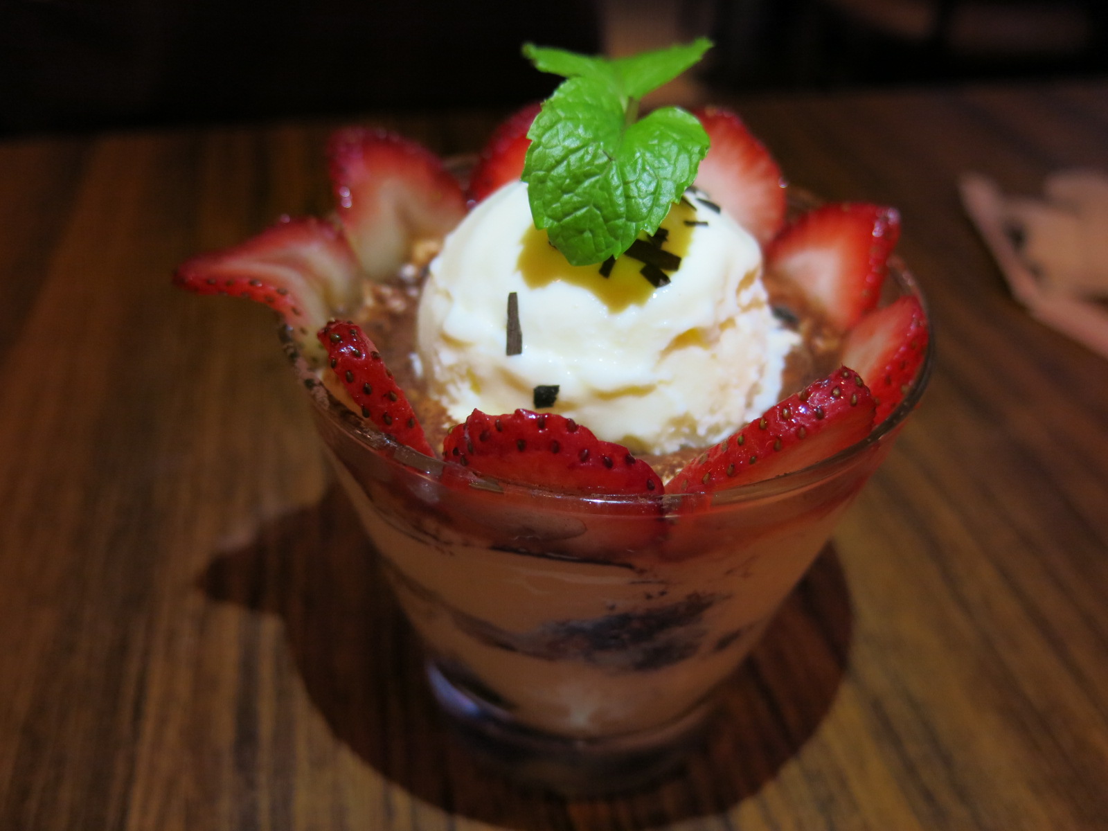 以草莓薄片裝飾的冰淇淋杯,底下冰淇淋底下是層層的巧克力蛋糕、餅乾與巧克力粉堆砌而成像提拉米蘇的口感的甜點,每一口都能吃到不同的滋味,而且甜度不像一般美式餐廳那麼死甜,一開始是酸甜的草莓味道,吃到下面則是巧克力為主角的提拉米蘇口味,這份蜜甜心冰淇淋杯擁有豐富多元的層次,特別極了!