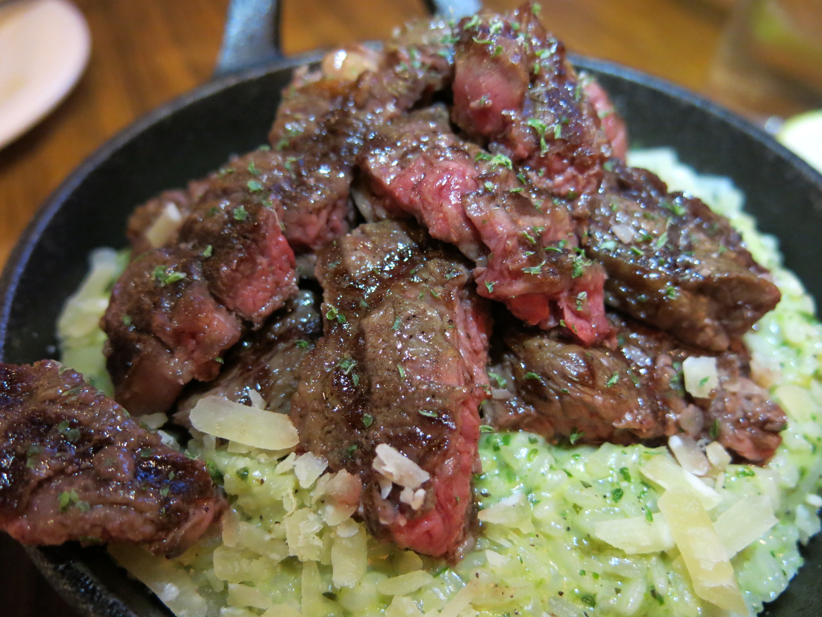 相較之下鹽之花沙朗牛排蘿勒飯的牛排份量就很多,切成條狀的牛肉,密密地蓋在青醬的飯上,也是灑滿起司,牛排可以選擇熟度,這份我們選擇七分熟,但仍然煎得軟嫩,青醬飯可以看到羅勒葉的碎片,新鮮羅勒香氣讓飯吃起來很清新,加上浸滿肉汁香氣,讓這飯更加好吃!