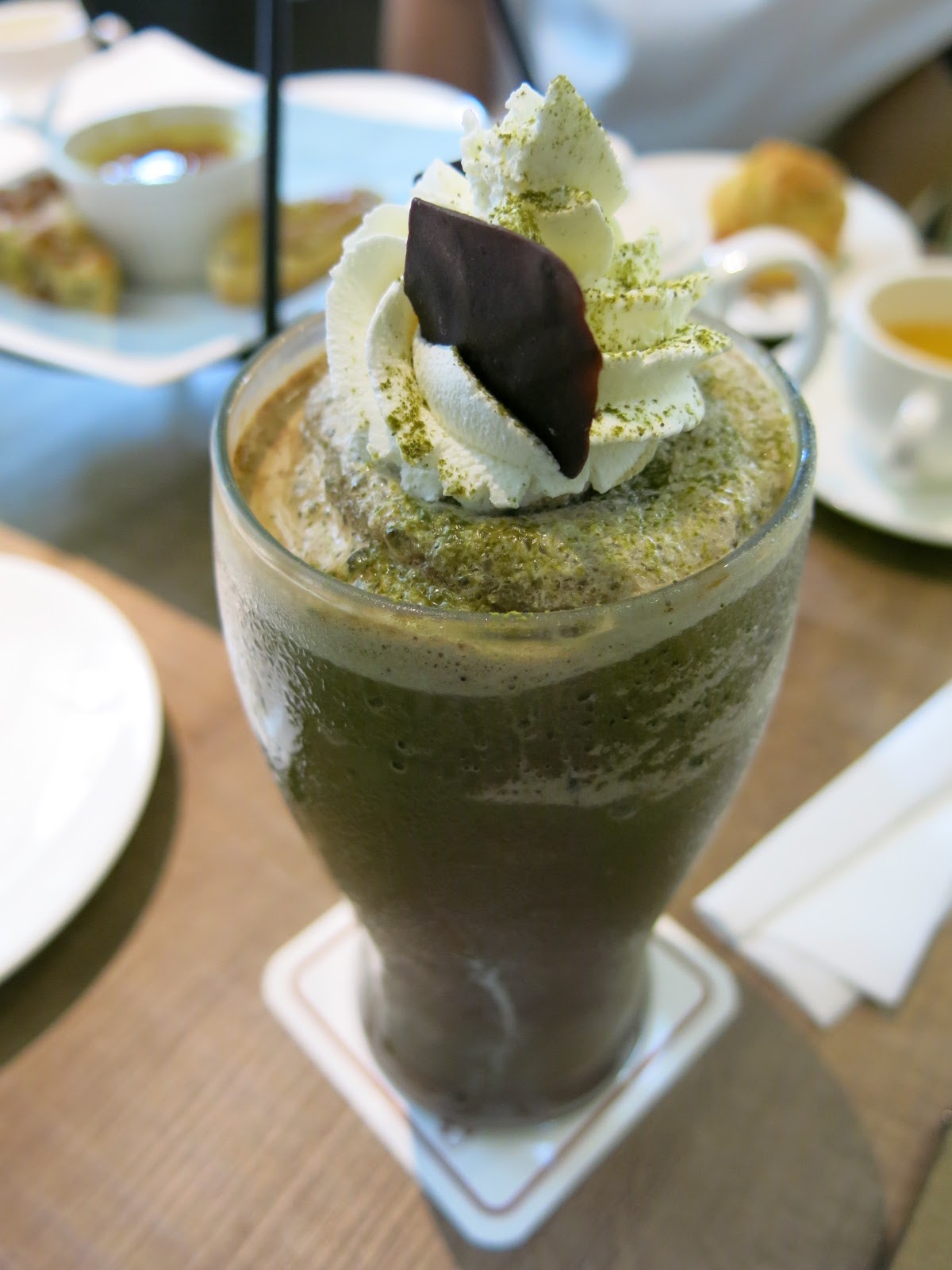 另外招待的抹茶可可冰沙,看起來冰涼沁心,化解了窗外的暑氣,呈現出沒有添加色素的抹茶自然色澤,搭配著巧克力與鮮奶油的杯口裝飾非常吸引人,剛開始喝的時候,喝到的是冰沙的細細顆粒口感,稍等五分鐘再喝,就是很沁涼的抹茶冰飲,微甜的滋味,讓抹茶的茶香與甜點互相平衡,每吃一口蛋糕都想飲一口抹茶,就是這個效應!