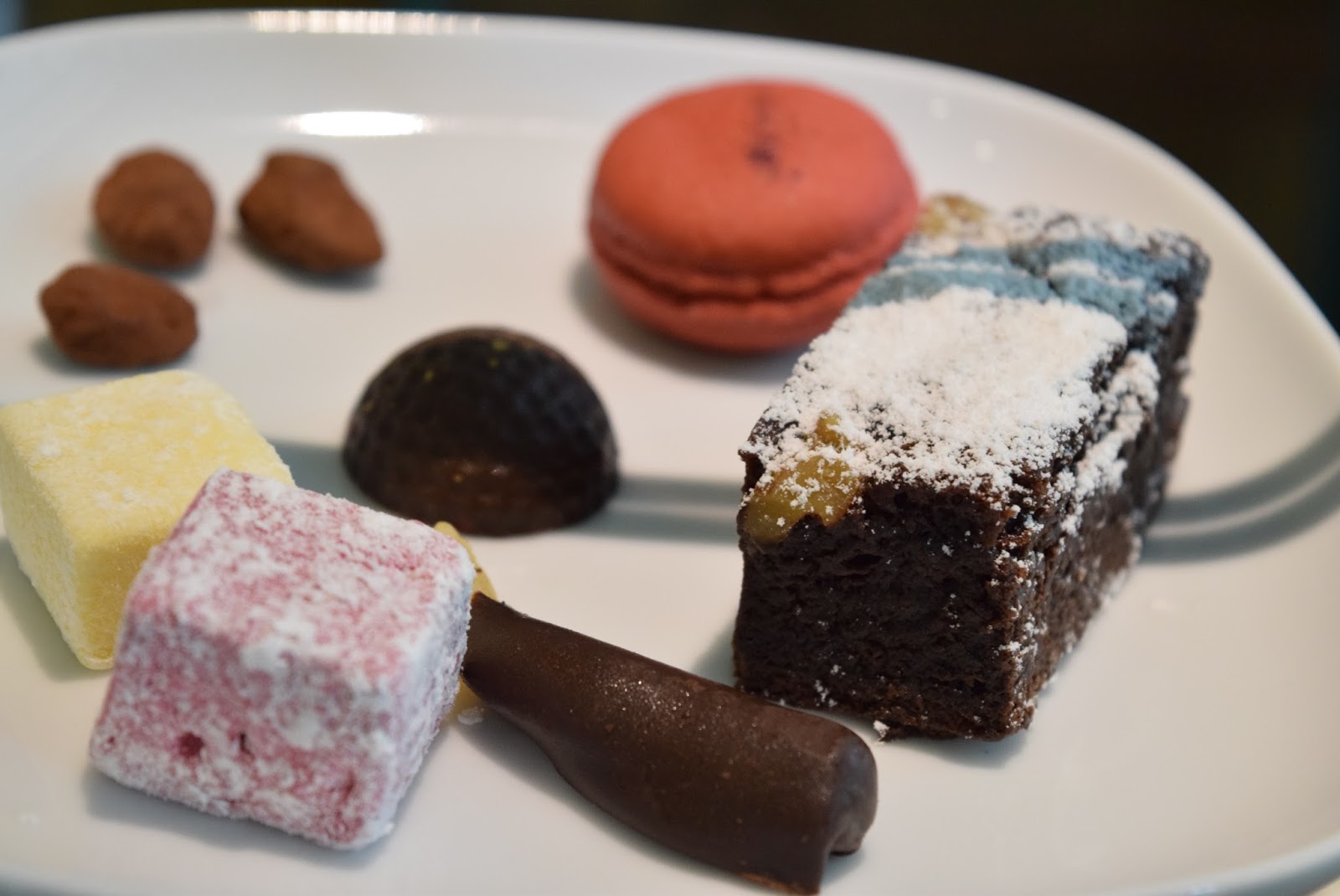 這盤中還有各式各樣的手工巧克力,並附上一個經典嘆息布朗尼,布朗尼蛋糕非常的濕潤,巧克力的濃厚,質感屬上乘。另外還有三顆分別是焦糖、芒果、百香果的巧克力,值得一一品嚐。