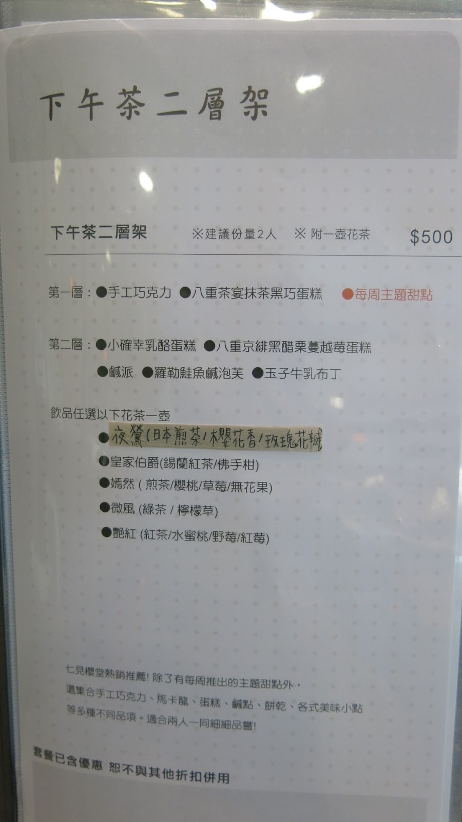 這套三層架甜點可選兩壺花茶,我們選擇了夜鶯與嫣然,夜鶯是以日本煎茶為主基調,帶著櫻花與玫瑰花香,黃色的茶湯帶著淡雅的香氣,不酸不澀,與甜鹹點搭配起來很和諧!嫣然是一壺帶著果香的花茶,茶色略橘,以日本煎茶為主調,當中帶著櫻桃、草莓、無花果的味道,果香迷人、滋味清新,這兩款茶不加糖就很順口。