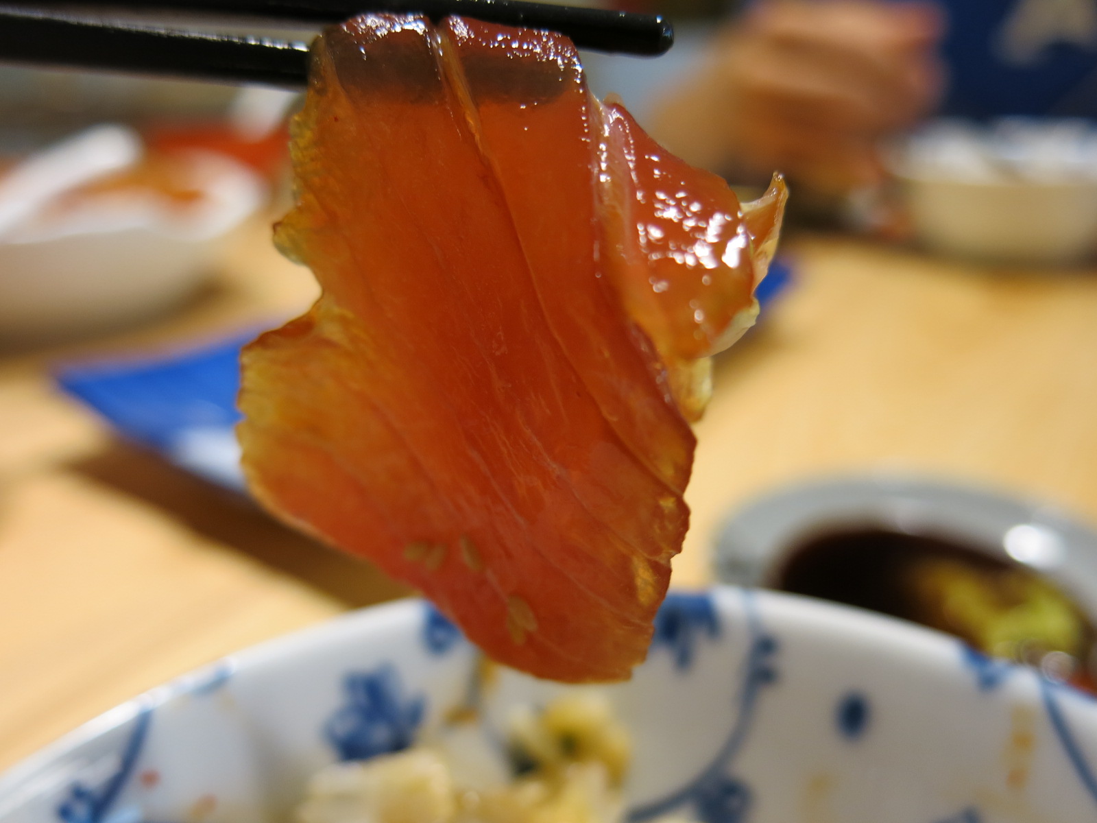 經過特製醬汁醃漬過的鮪魚色澤非常迷人,厚薄度切得恰到好處的酒紅色魚片夾起來依舊透亮閃耀著美味的光芒。