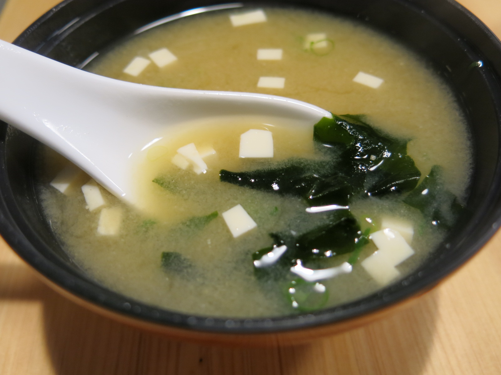 味噌湯的配料切得很精緻,每口都吃得到嫩豆腐與海帶芽,屬於偏鹹的日本口味。
