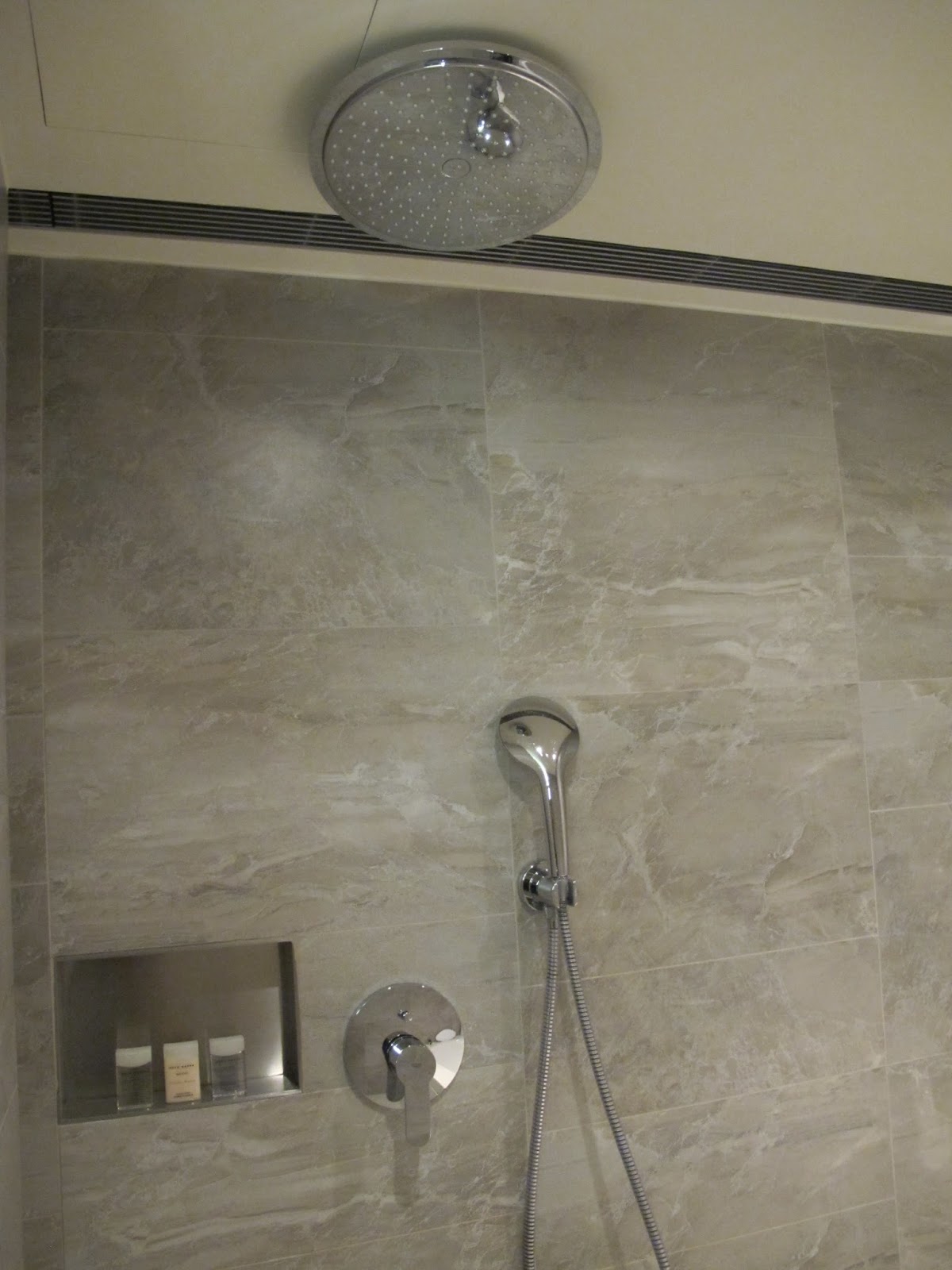 淋浴區有兩種花灑,天花板上的雨淋式花灑,水量真的像雨滴一樣,會輕輕灑落,沖起來有著自然的舒適感,值得一提的是這裡的沐浴乳、洗髮精雖然不是甚麼知名大牌,但香氣非常淡雅。