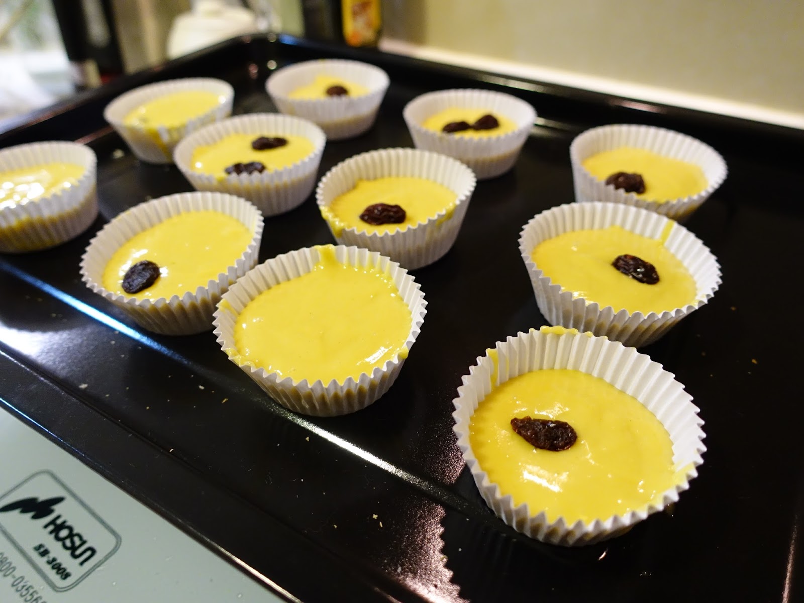 將攪拌好的麵糊舀入紙杯中,我還加入了一些葡萄乾。