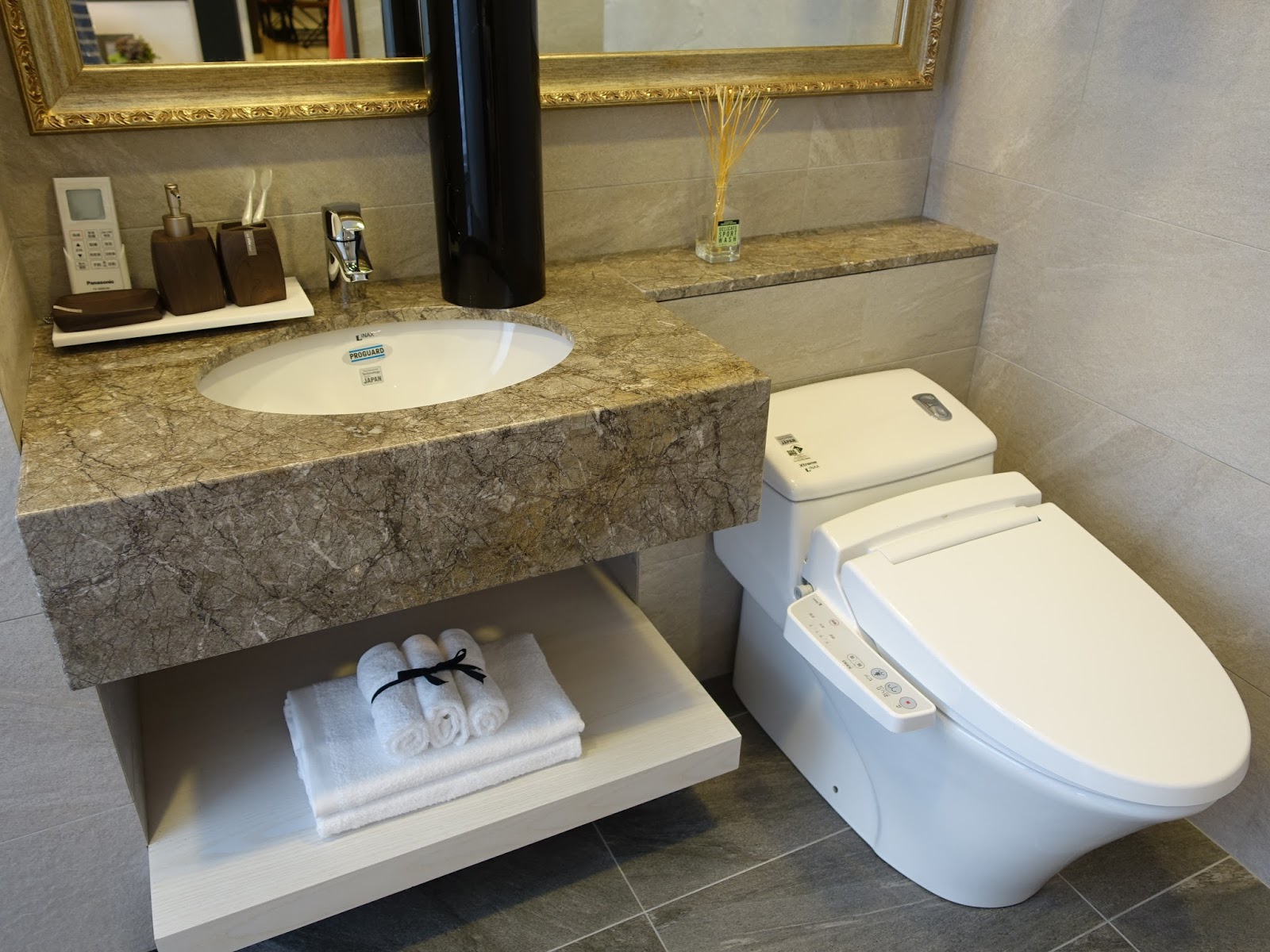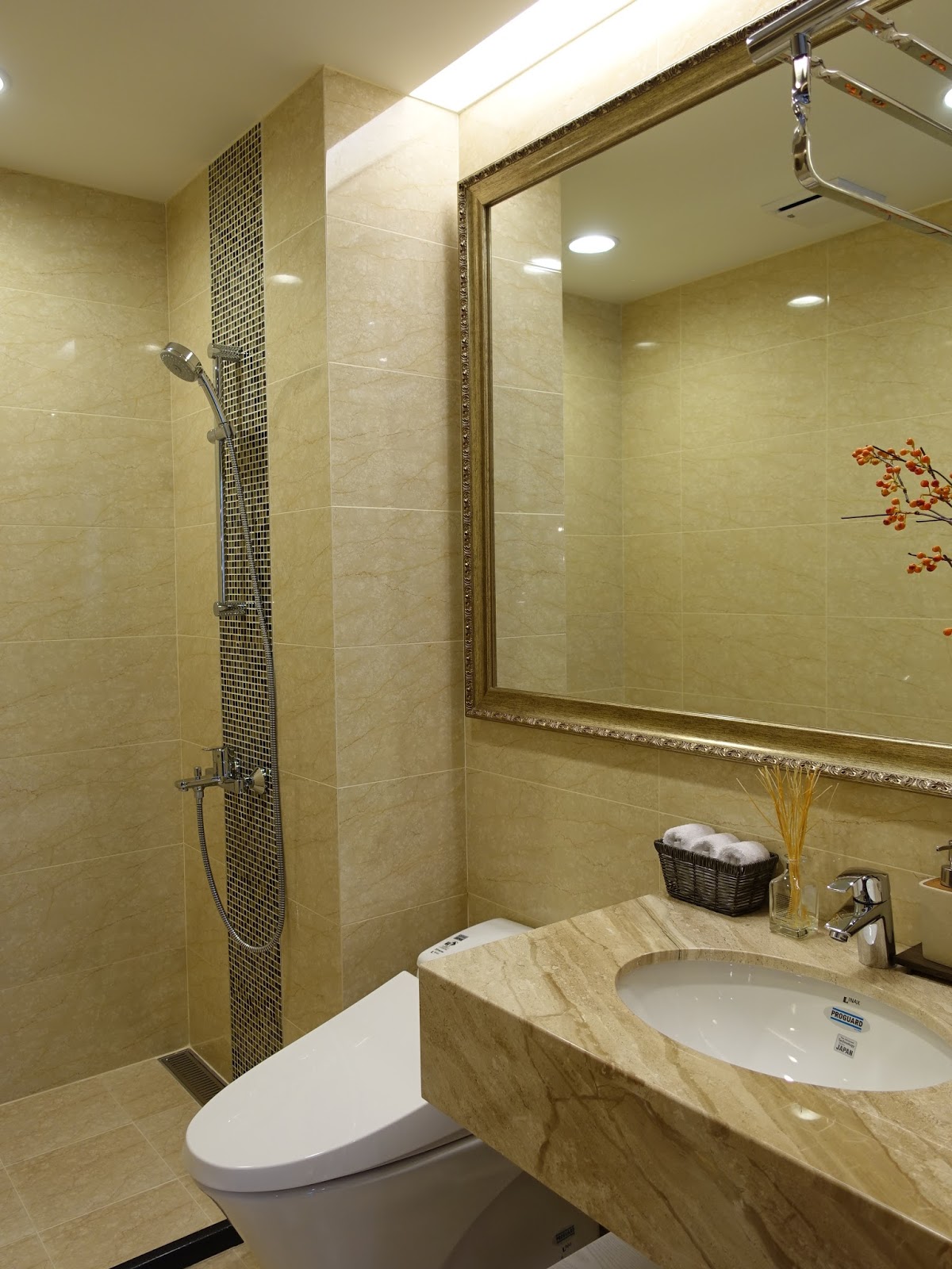 採用日系進口的免治馬桶INAX、石材面板的檯面與新古典風格的鏡子,讓浴室的質感不凡。