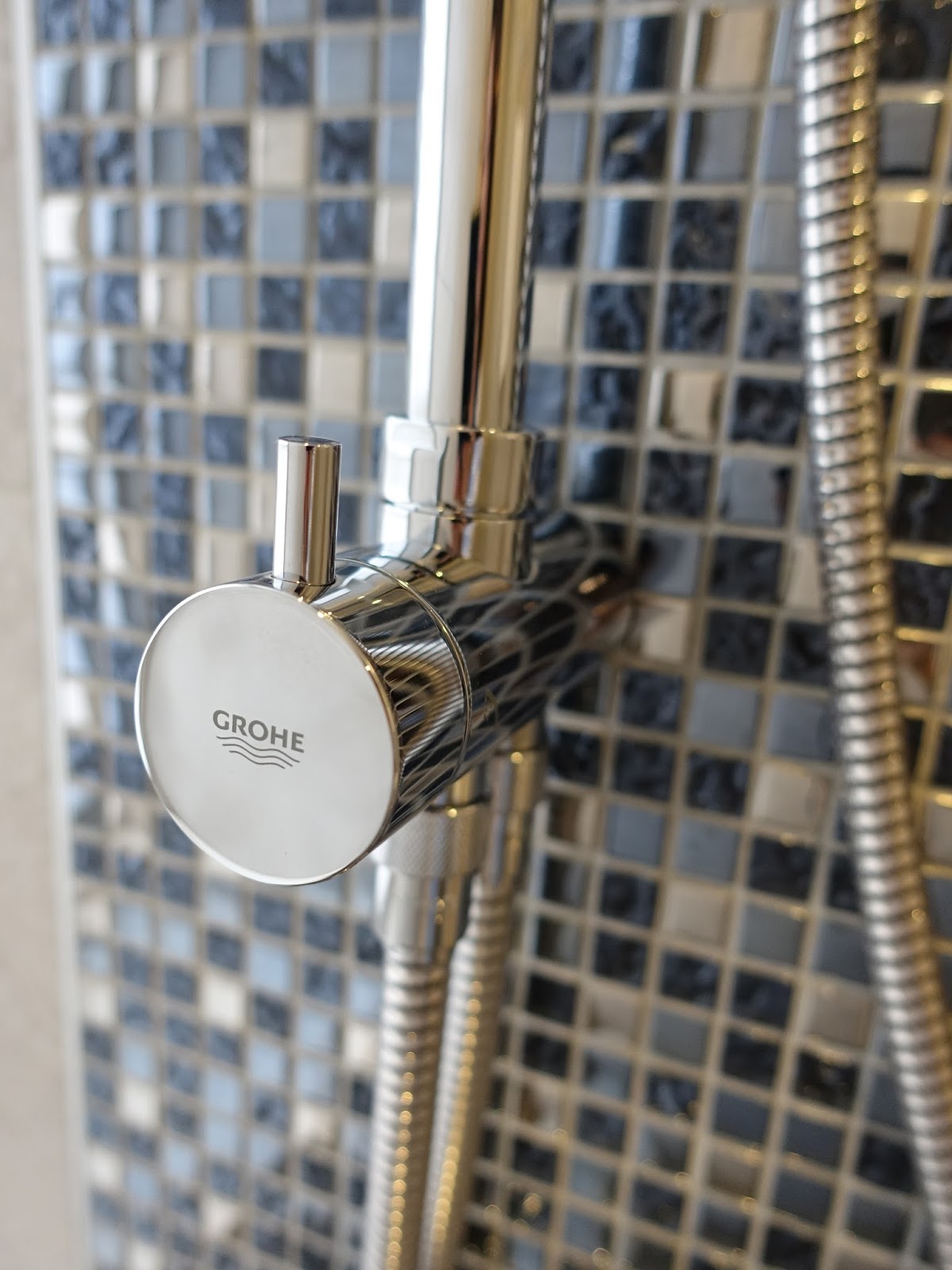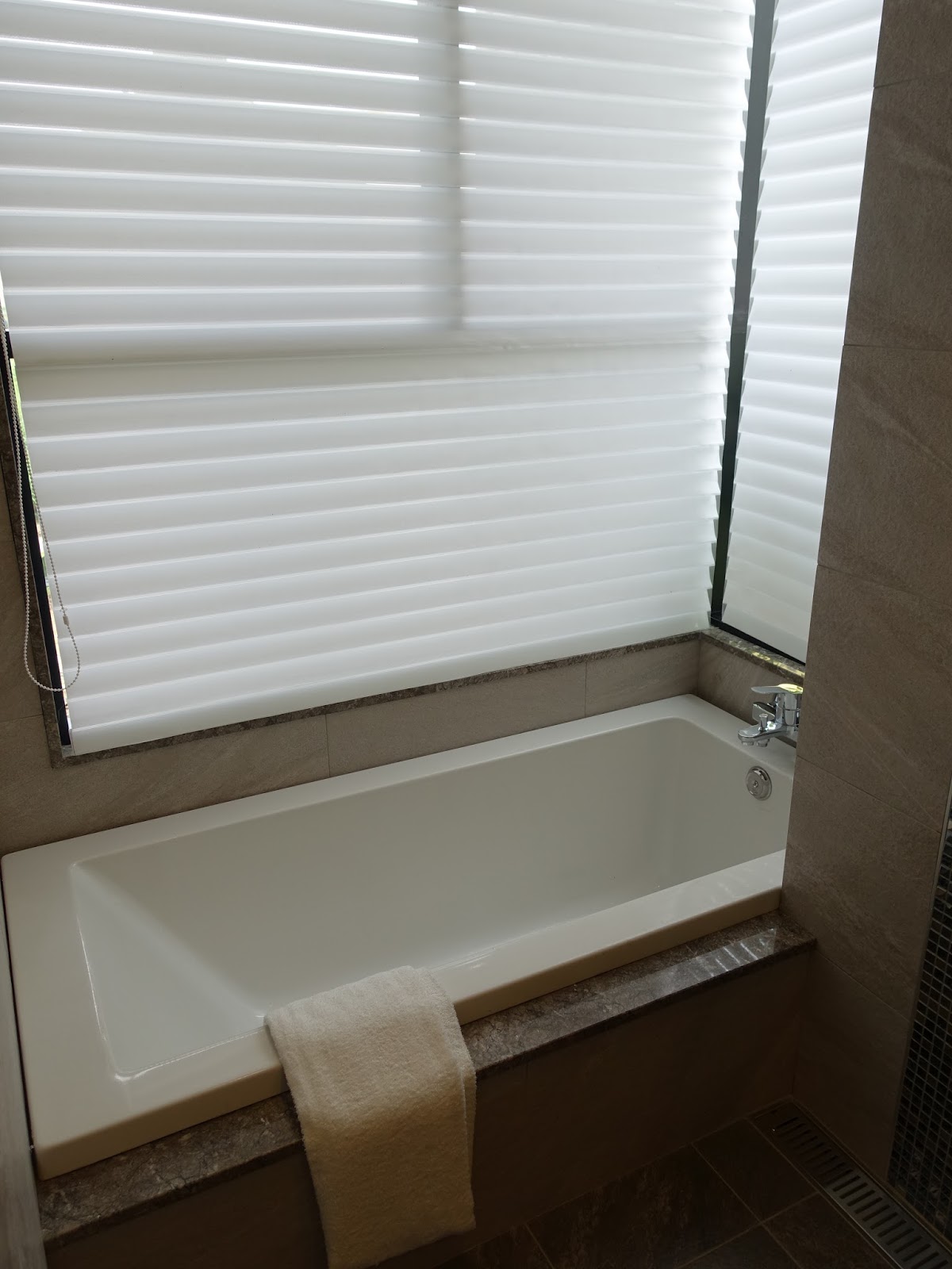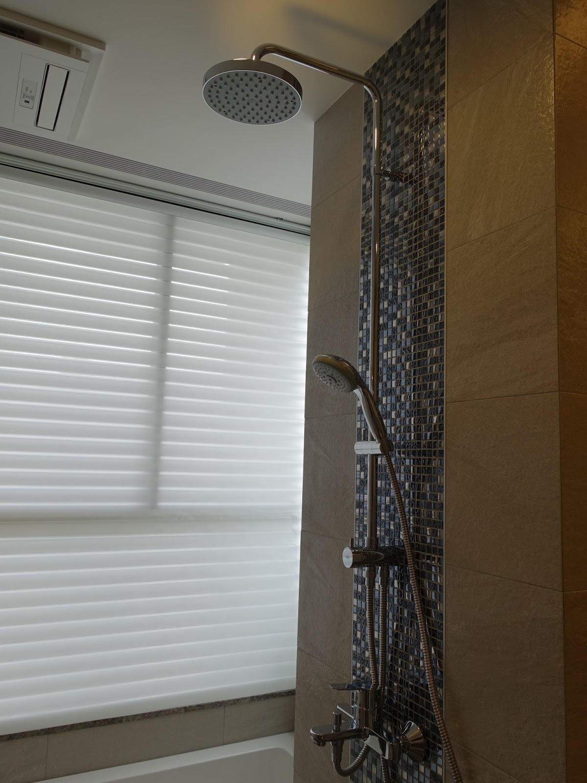 主臥衛浴的浴缸檯面及洗臉檯面以石材精緻打造,蓮蓬頭更採用德國精品衛浴Grohe品牌,擁有五星級飯店的質感,最難能可貴的是浴室也有大開窗,在降板浴缸側面將光線引入,採光不但明亮而且透氣好,這樣的高品質浴室規劃在三房產品中實屬難得。