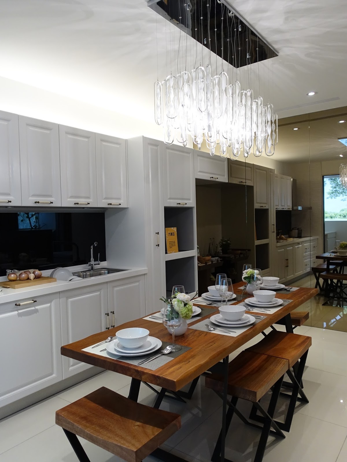 開放式的廚房空間規劃,可放置六人餐桌,與客廳的大空間互相呼應,邀請客人到家裡吃飯也能享受寬敞的用餐空間,自己使用時寬大的餐桌也同時是廚房工作桌,用餐後也能當成與小孩共讀的區域。