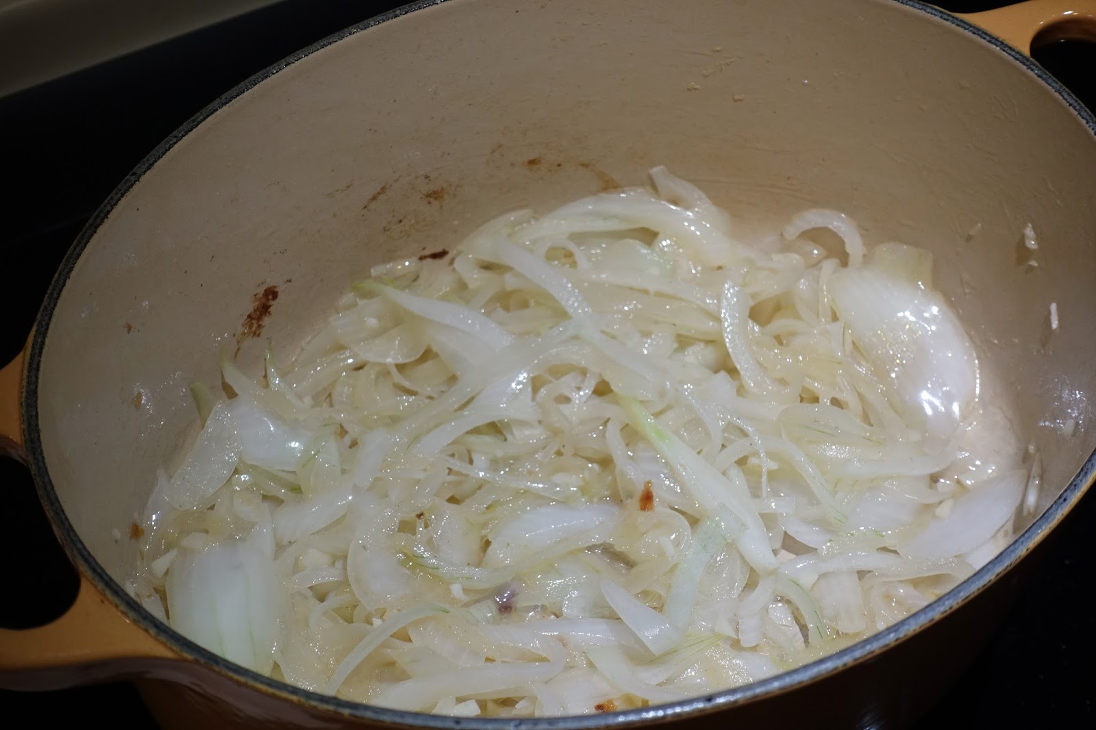 5.放入洋蔥絲與蒜末,使用小火翻炒約3分鐘,待洋蔥炒軟後取出。