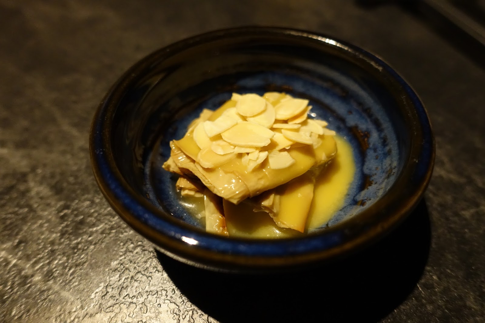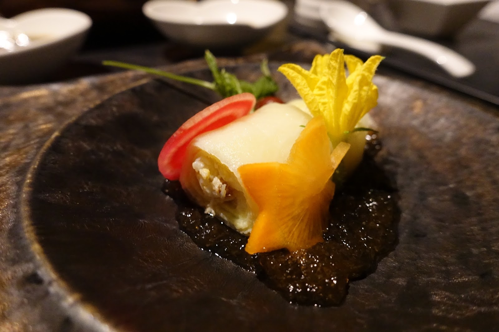 在火鍋上桌前,先上了兩道冷前菜,味增口味的腐皮捲帶著醋的微酸口感,吃起來頗特別。