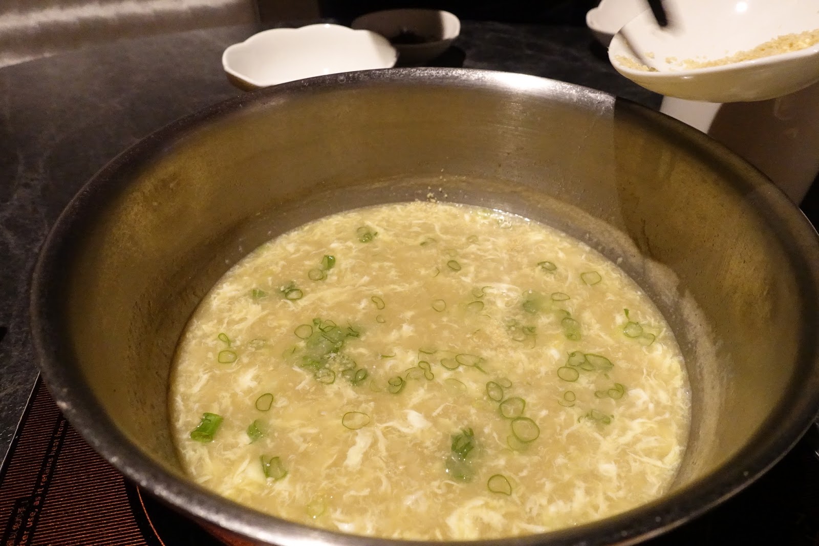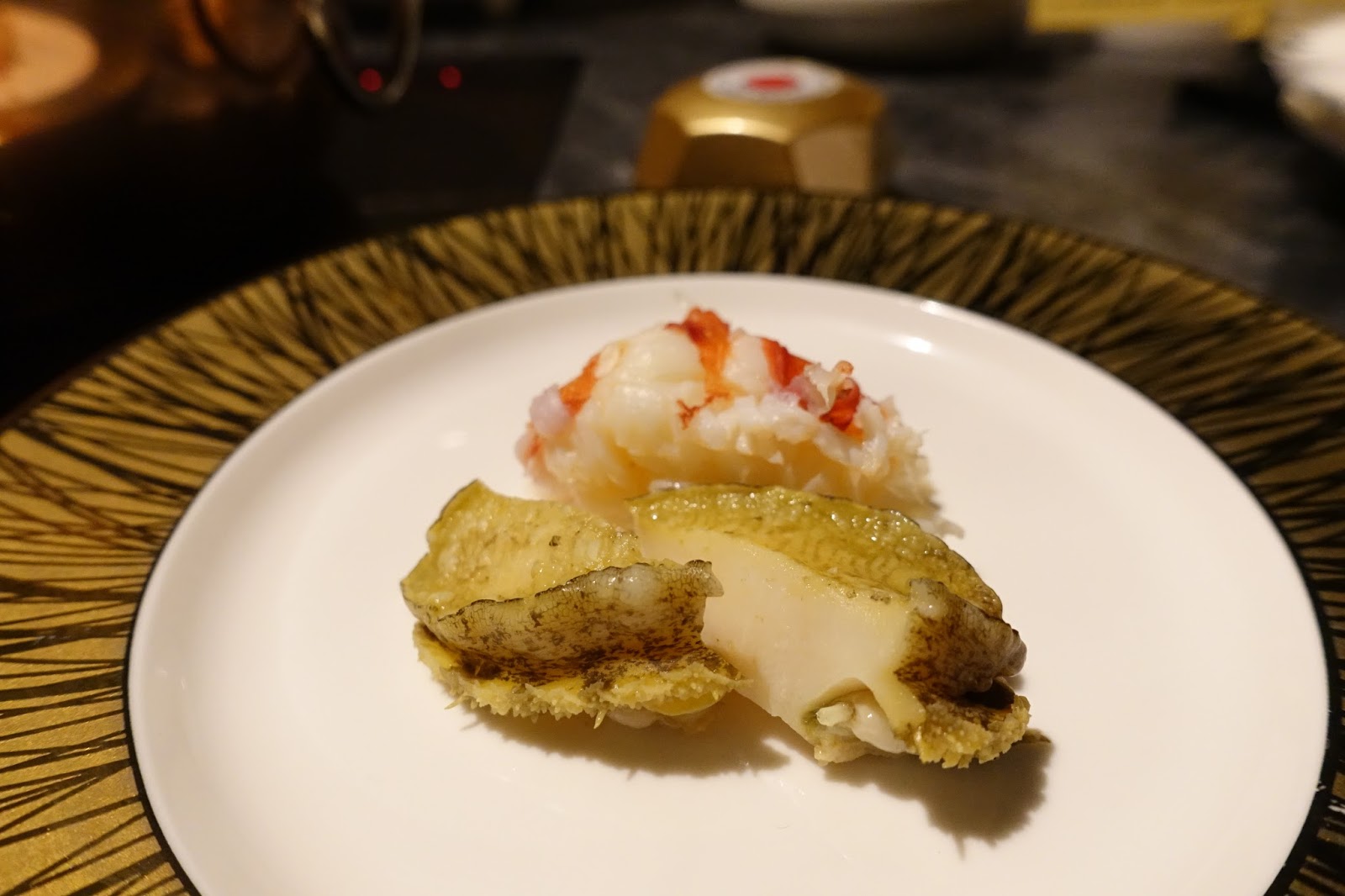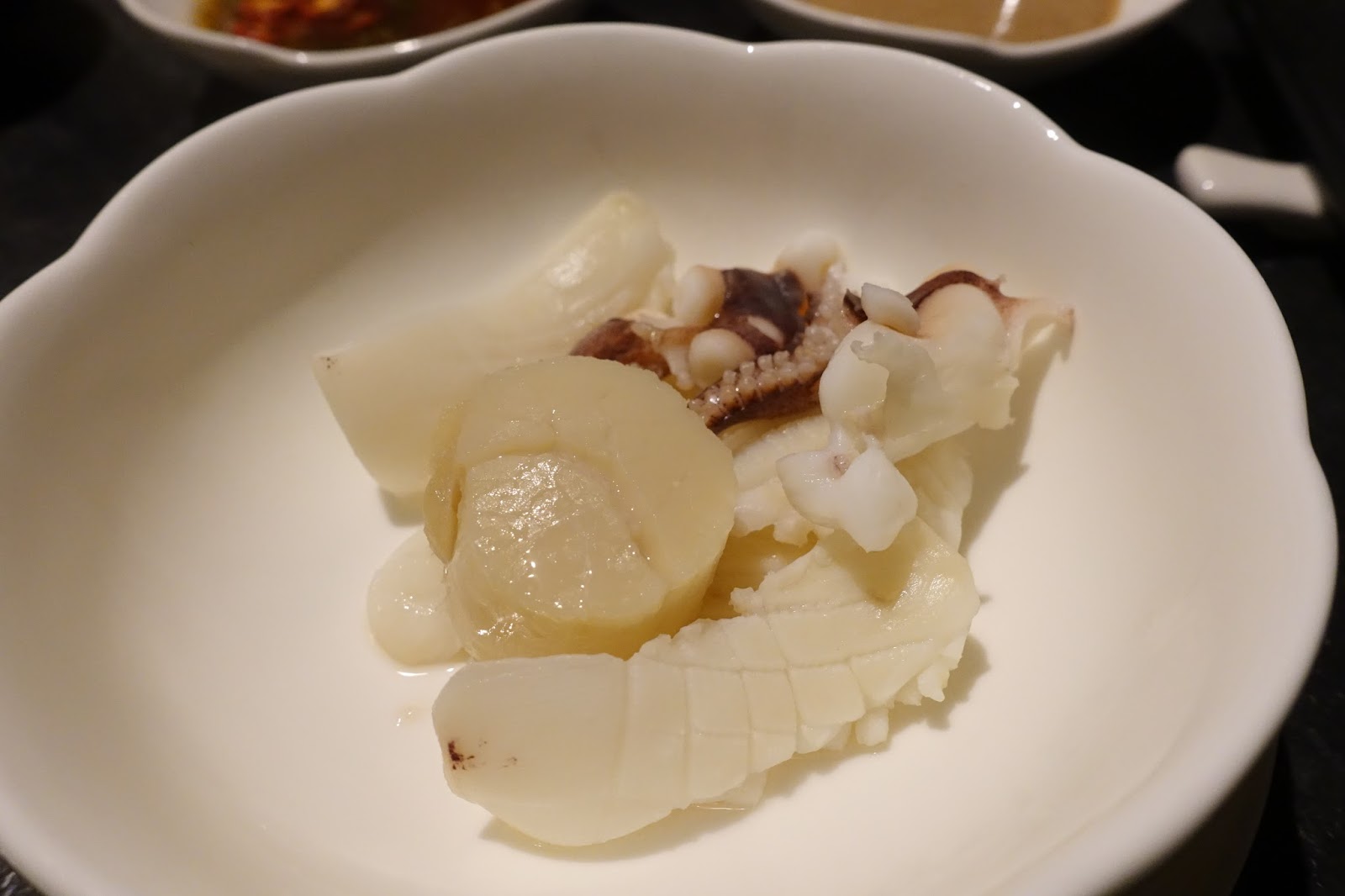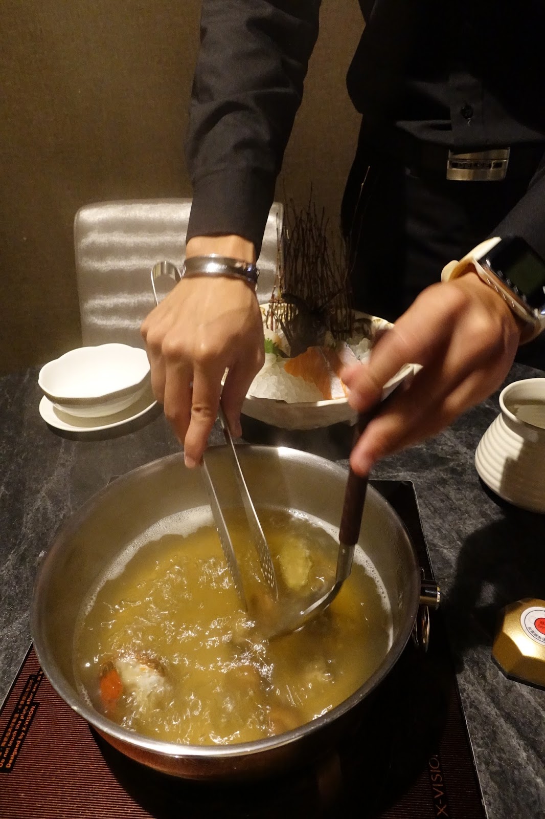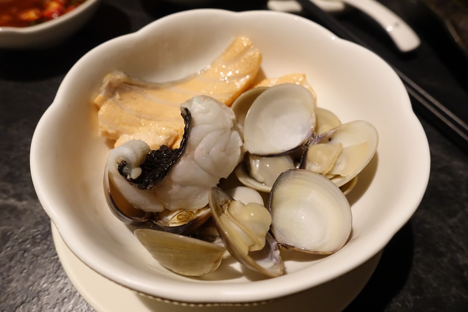 侍者很俐落地將海鮮順序放入以北海道昆布熬製的上湯中烹煮並計時,精準的烹煮每樣海鮮,讓魚肉煮得軟嫩度剛剛好,蛤蠣的鮮甜保留在肉質本身,這都是因為烹調的時間抓得很精準,帶皮黑毛魚的膠質與Q彈口感讓我留下深刻印象。