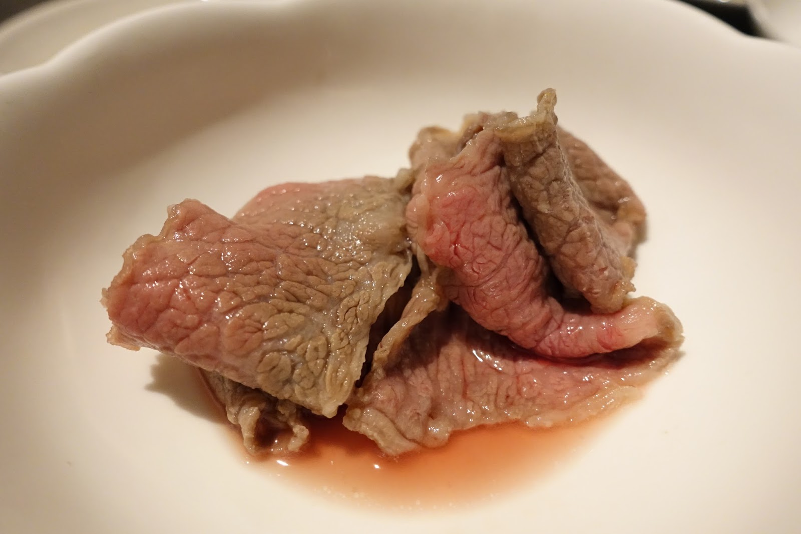 我觀察服務生用文火,微滾的熱湯慢慢將牛肉泡到五分熟,精準計算時間後取出,肉質呈現粉紅色、肉汁滿盈的模樣超級吸引人的,吃起來滑嫩不已,不沾醬料就很好吃。