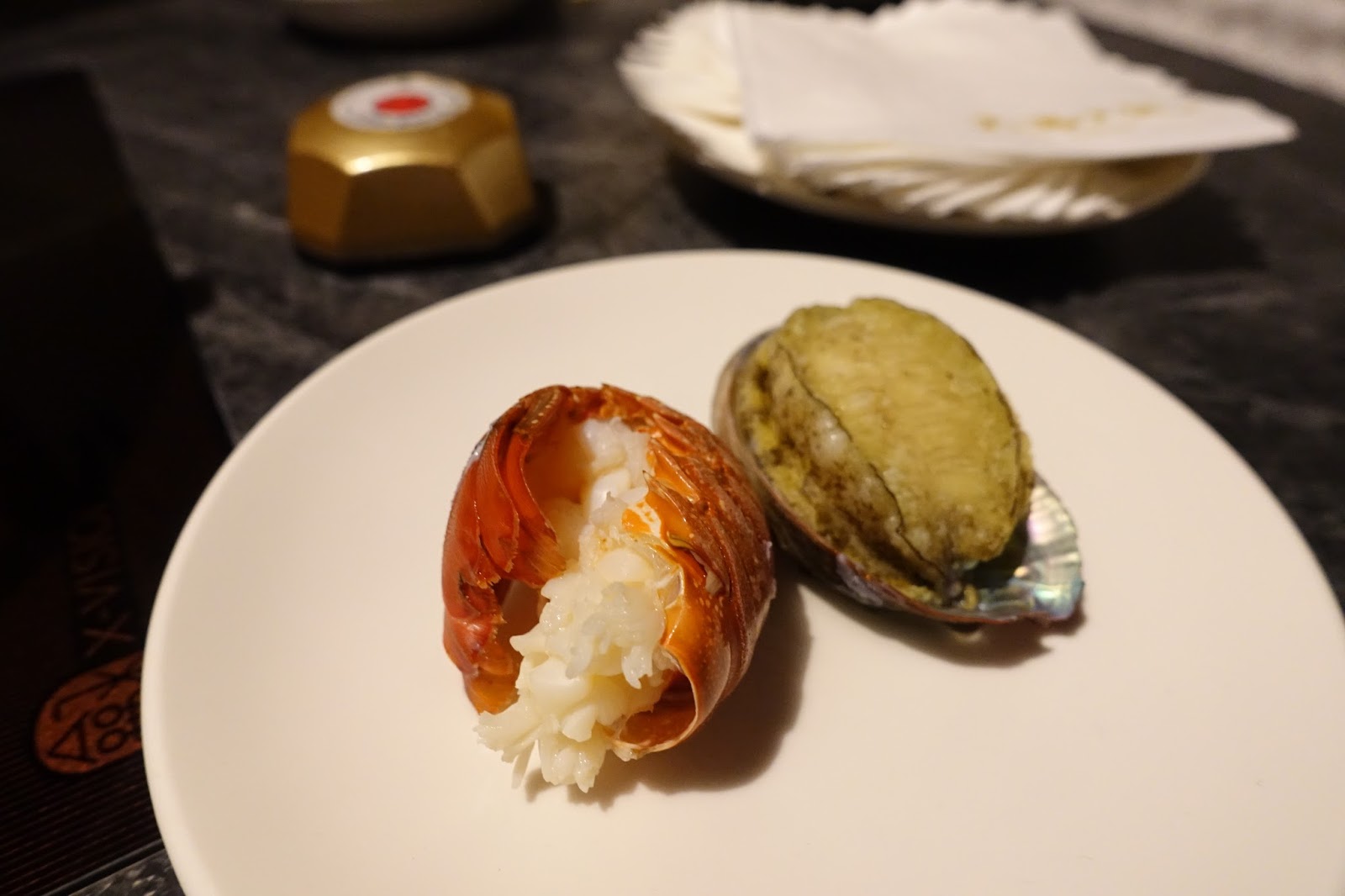 切成適口大小的九孔鮑,可以看到斷面的鮮嫩模樣,吃起來帶著Q度、新鮮的甜度表現得相當好;小龍蝦更是無可挑剔的美味,蝦肉軟嫩又帶著彈性,如果我自己烹煮可能無法控制得那麼完美!