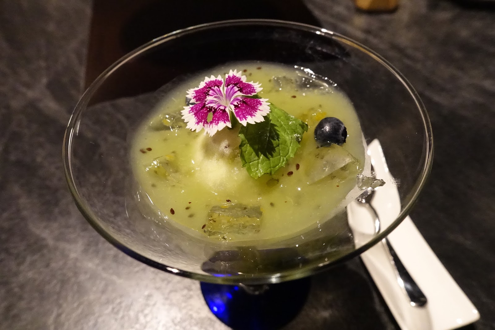 最後的甜點以奇異果泥為主調,圍繞著中央的奇異果冰沙,水果的酸甜口感及濃郁度相當豐富,而白酒果凍增加冰涼滑凍的口感,讓這份甜點更加精采!
