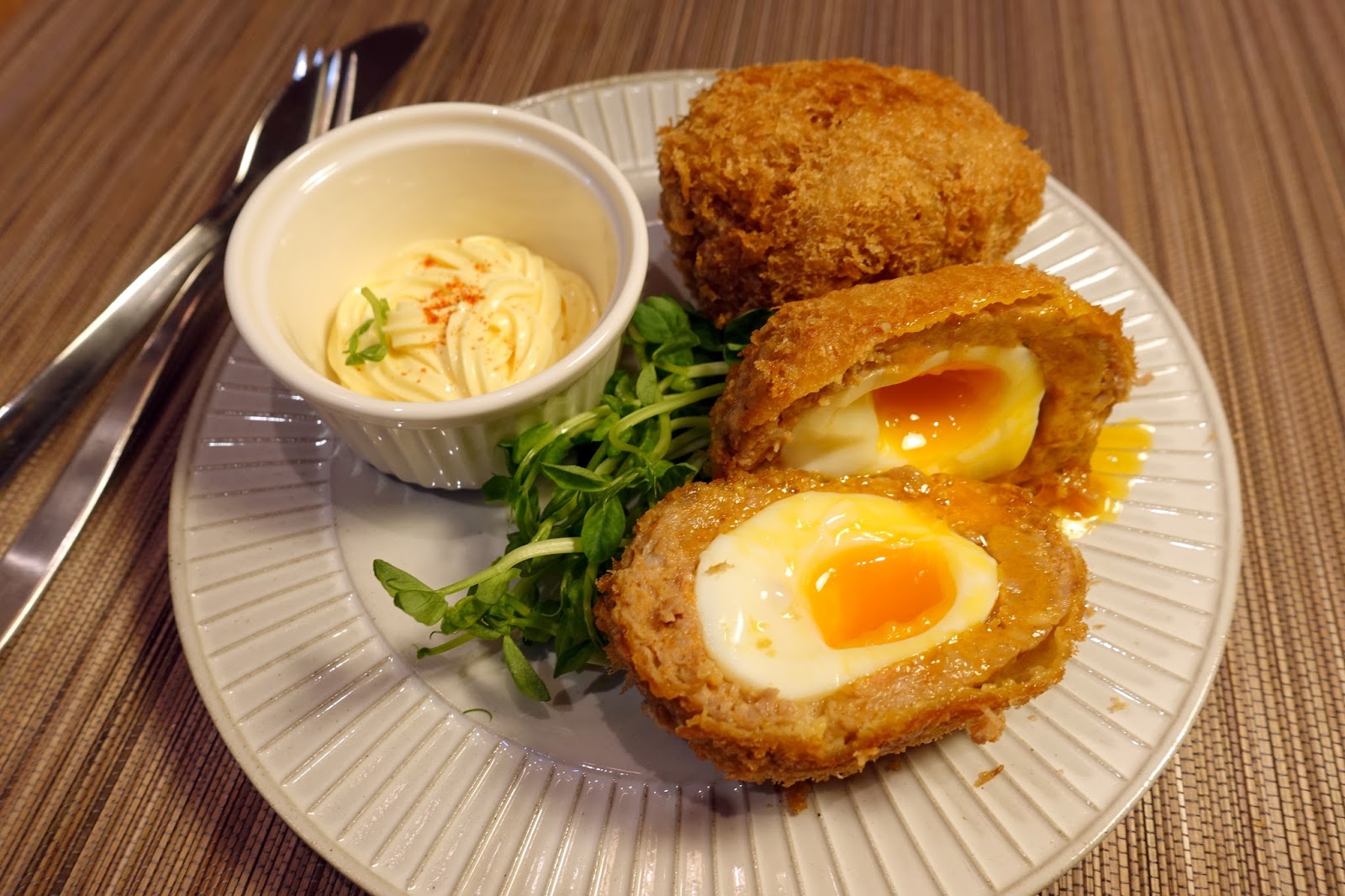 時下餐酒館最夯的蘇格蘭炸蛋,最吸引人之處莫過於把外表炸得酥脆、而切開蛋黃依舊維持著半熟的流動感,那外酥內嫩的曼妙口感,讓人忍不住一口接一口!