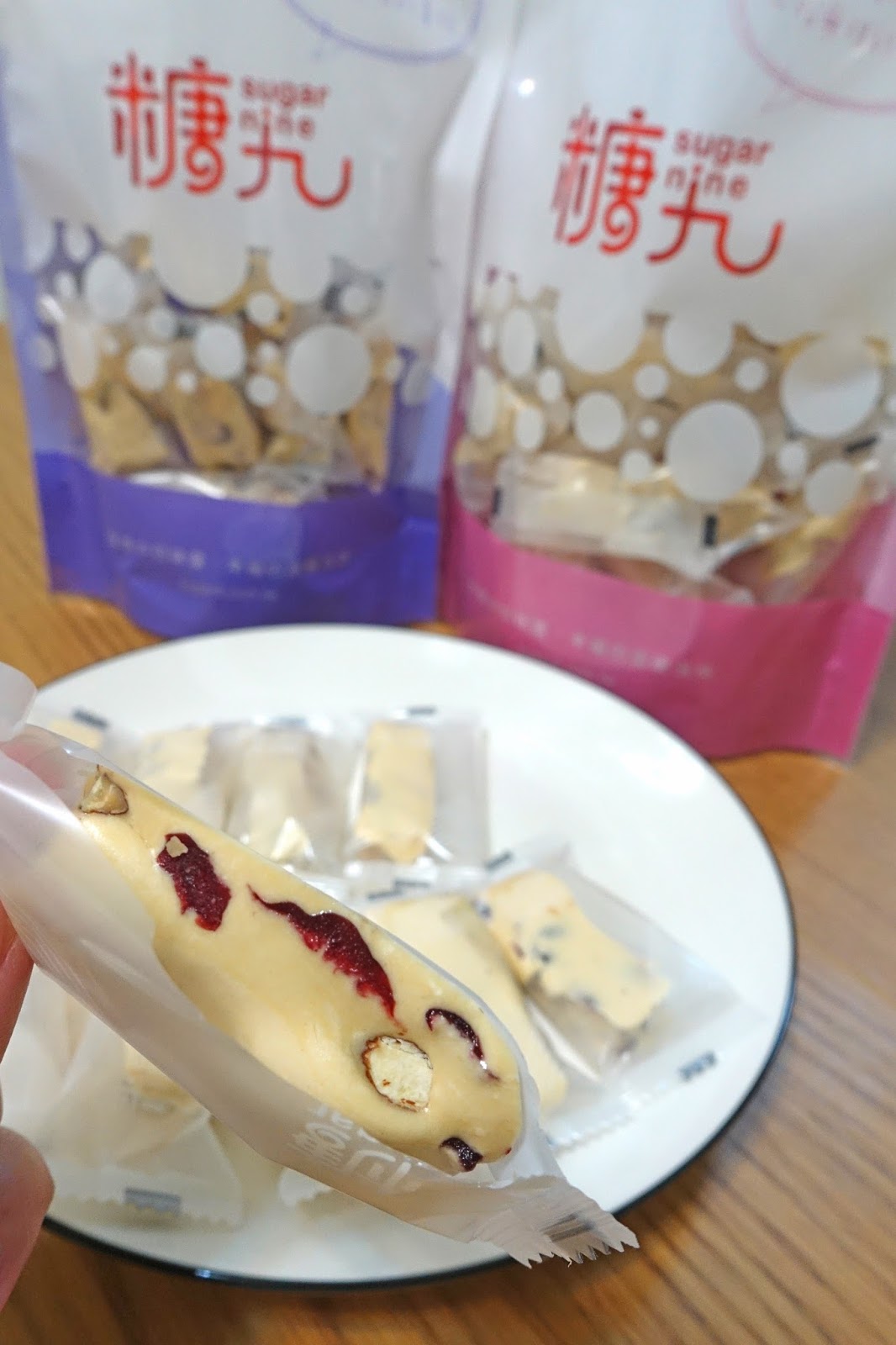 糖九的蔓越莓口味的牛軋糖深受女性喜愛,酸甜的蔓越莓滋味融入牛軋糖中,越吃越唰嘴!