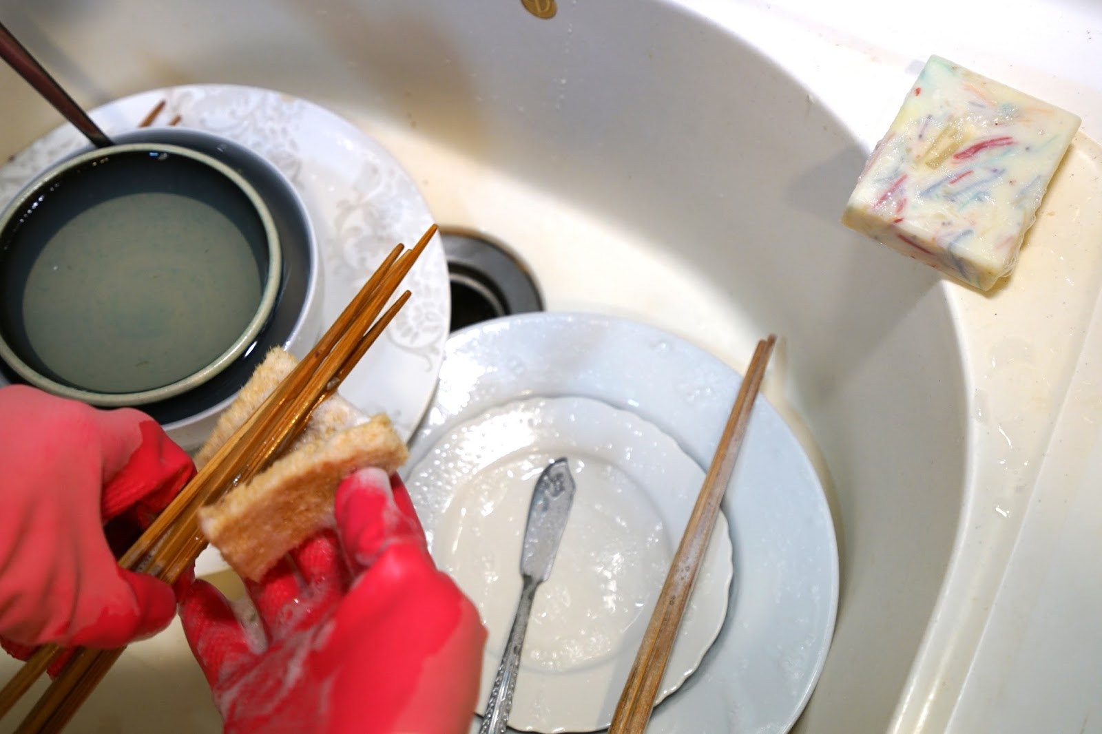 洗碗時以菜瓜布直接塗抹艾達環保家常皂,就會產生泡沫,然後就像往常一樣使用,就可以把碗盤洗得乾乾淨淨。