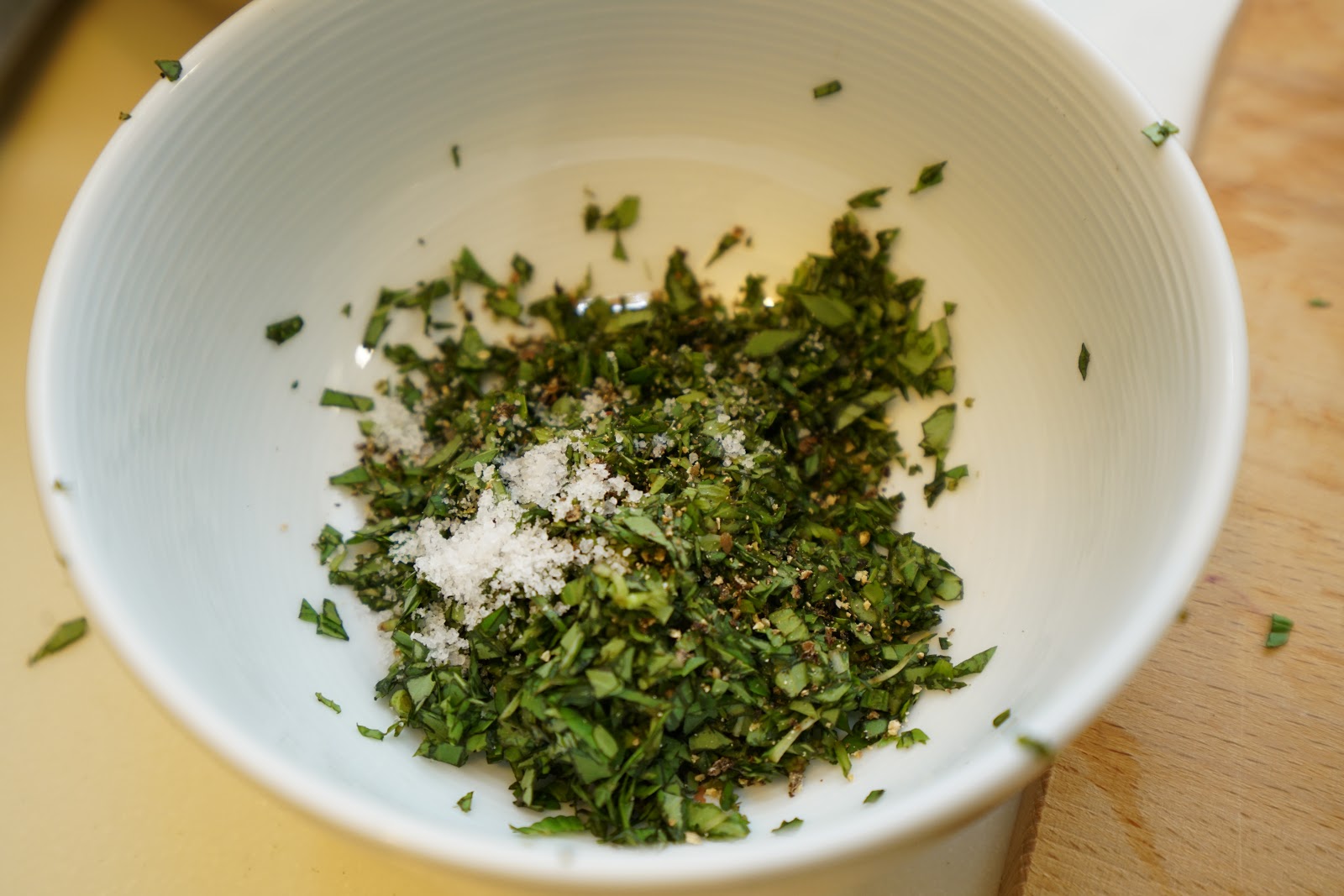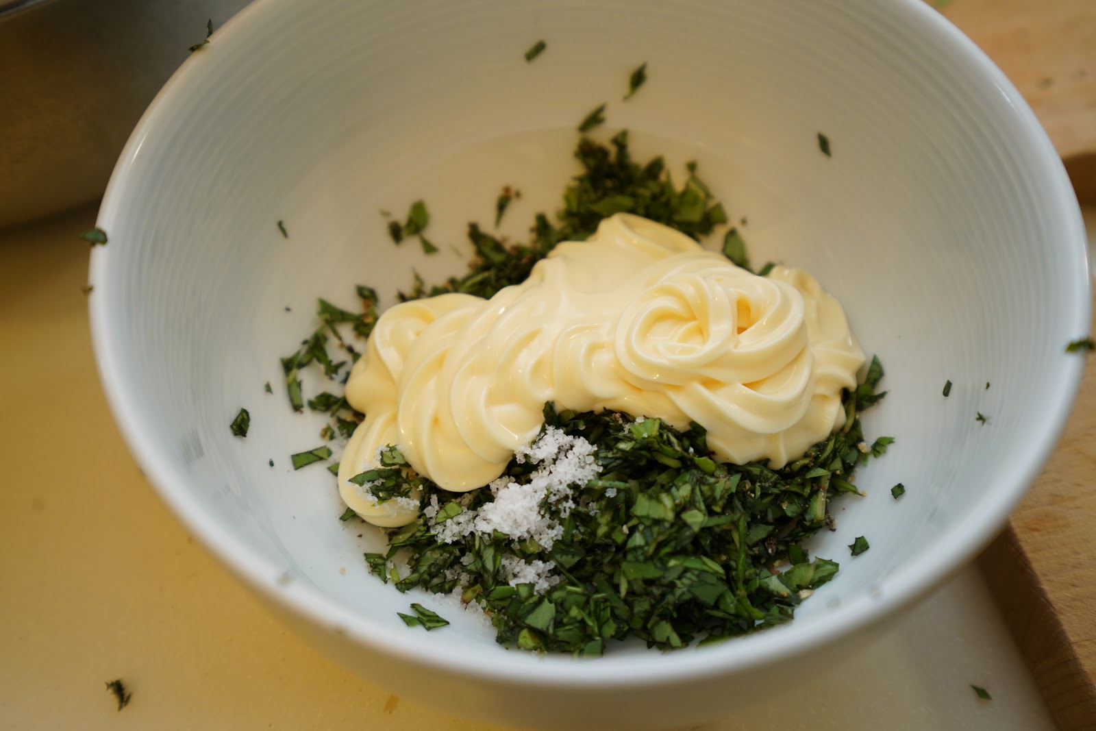 2.把九層塔切碎放入鹽、胡椒、美乃滋、檸檬汁,攪拌均勻。