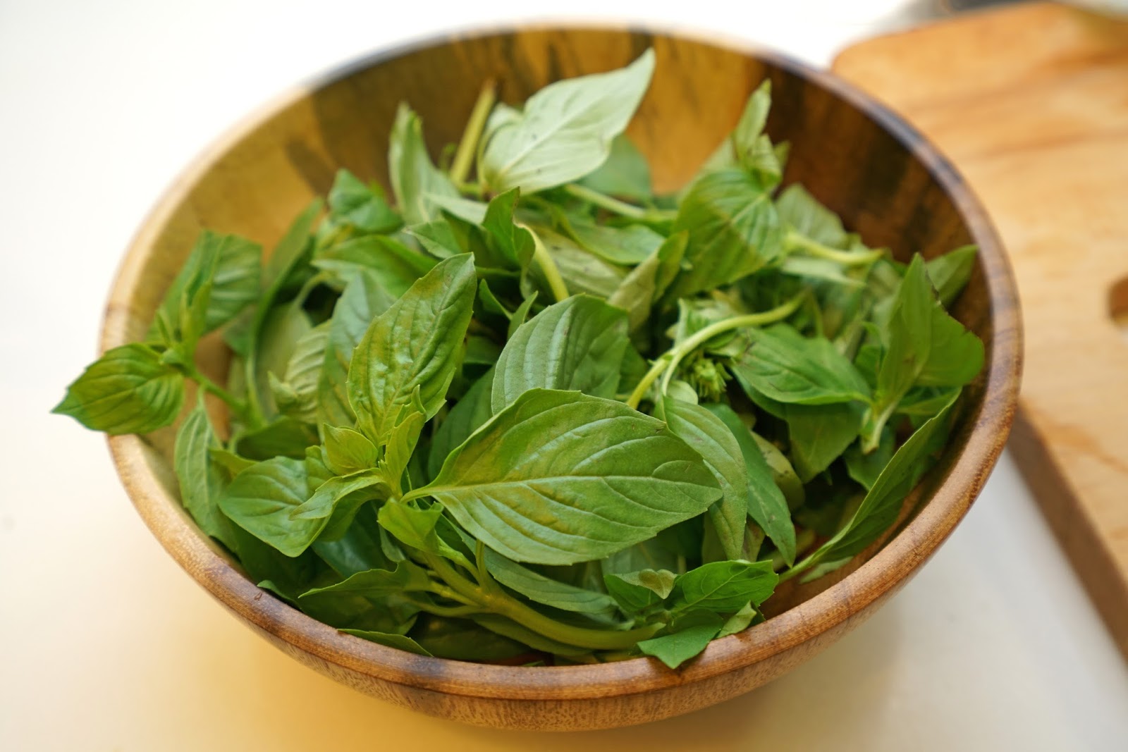買到一把翠嫩的九層塔,用它來做馬鈴薯沙拉正好,放在木碗裡好好看喔!