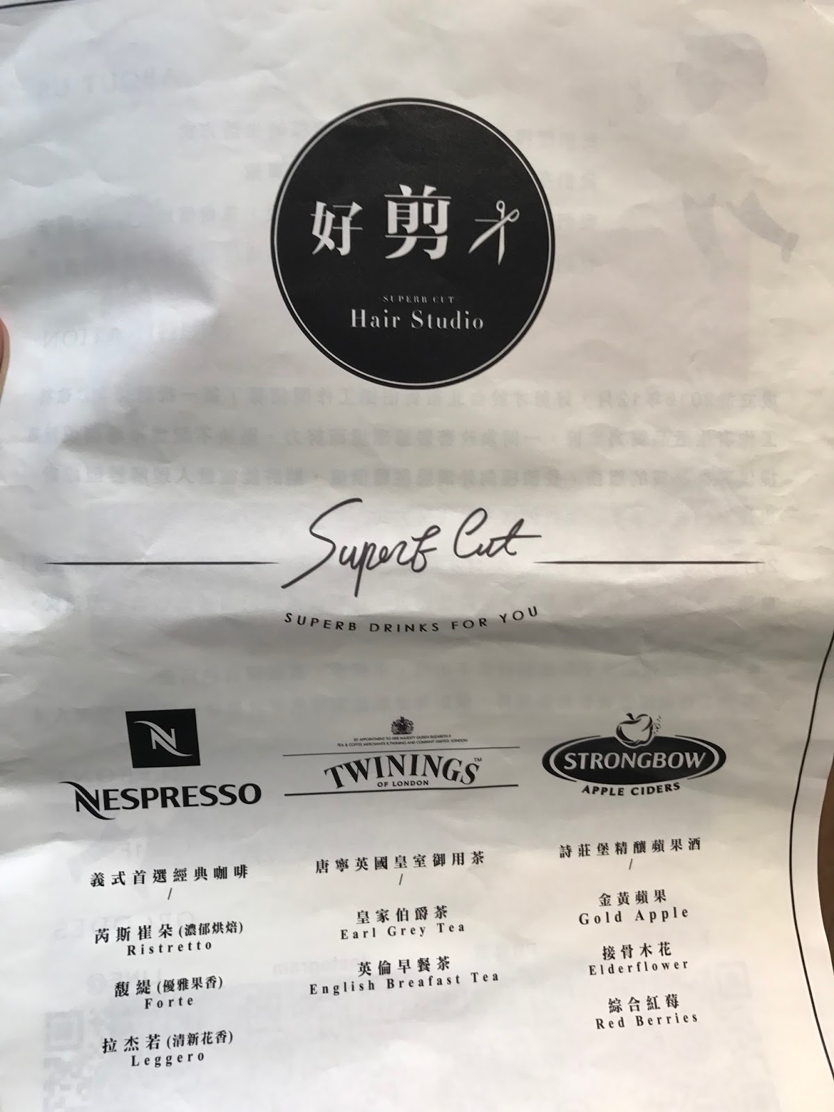進店後,助理親切的引導我入座,然後殷勤地幫我準備雜誌和飲料,好剪才的飲品可媲美咖啡店,不但提供Nespresso的義式咖啡、英國的TWININGS紅茶,還有詩莊堡精釀蘋果酒,來這裡做頭髮真的很享受。