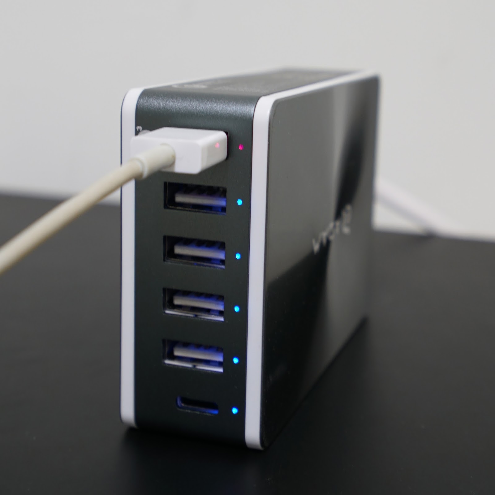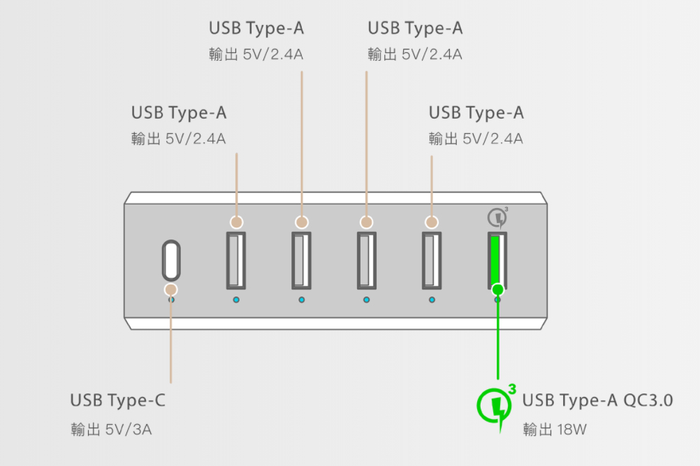 中間的4個 USB 插槽可同時獨立以 5V/2.4A 輸出,最右側的插槽是Quick Charge 3.0高通快充充電,可支援3.6-6.5V/3A, 6.5-9V/2A,9.1-12V/1.5A的充電規格。有一次要出門工作前才發現手機已經沒電卻忘記提早充電,這時就需要用QC3.0快速充電,在緊急時救援你的手機,讓它們快速回復電力!