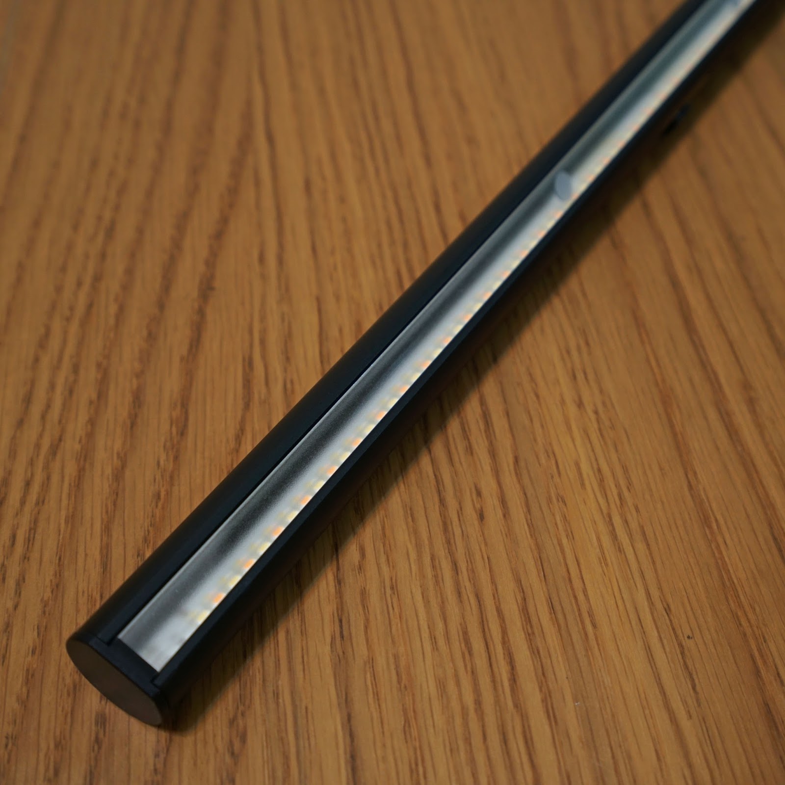開啟電源後,中間偏右有個偵測器是環境光感應器,它能主動偵測桌面環境,自動補足照度500勒克斯,剛剛好的亮度讓眼睛看得好舒服,光線筆直照射桌面、不閃爍,補足螢幕前70cm x40cm工作區域亮度,螢幕不會反光,只照桌面不照螢幕的非對稱設計光學設計,讓鍵盤照得清清楚楚,讓我的眼睛在工作時更舒適。