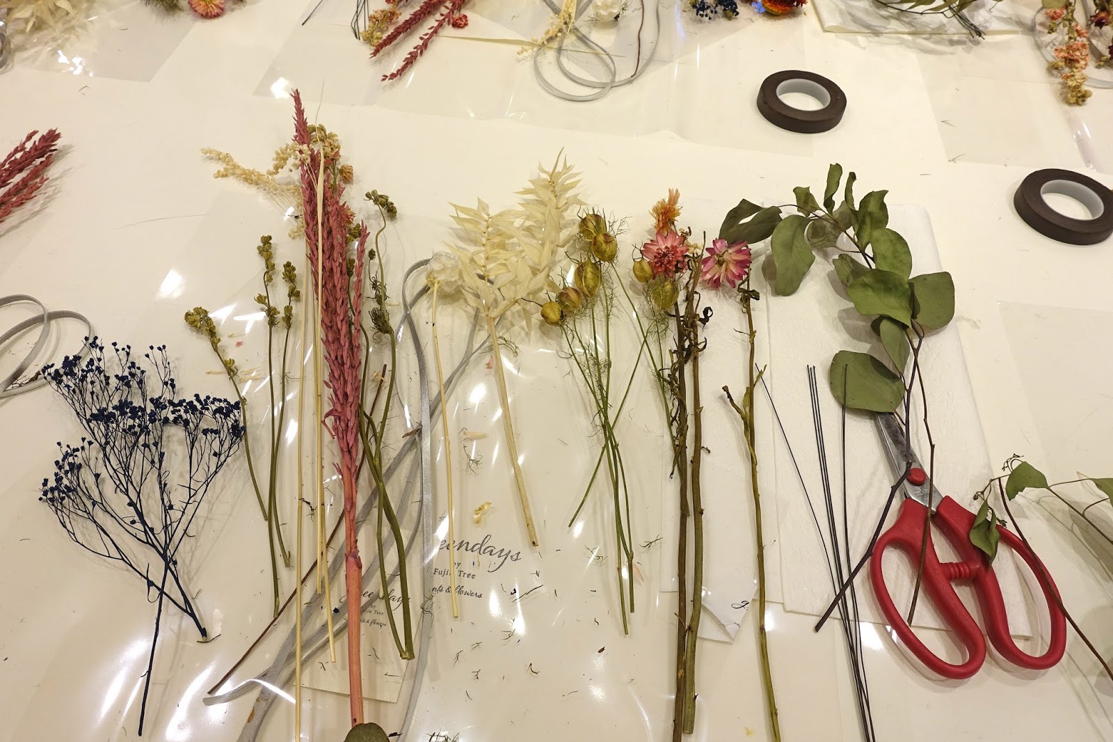 把分配到的花材都先整理好,去除底下多餘的葉子,進口的乾燥花真的非常漂亮,有種特殊的自然氣息,依舊帶著花草香氣。