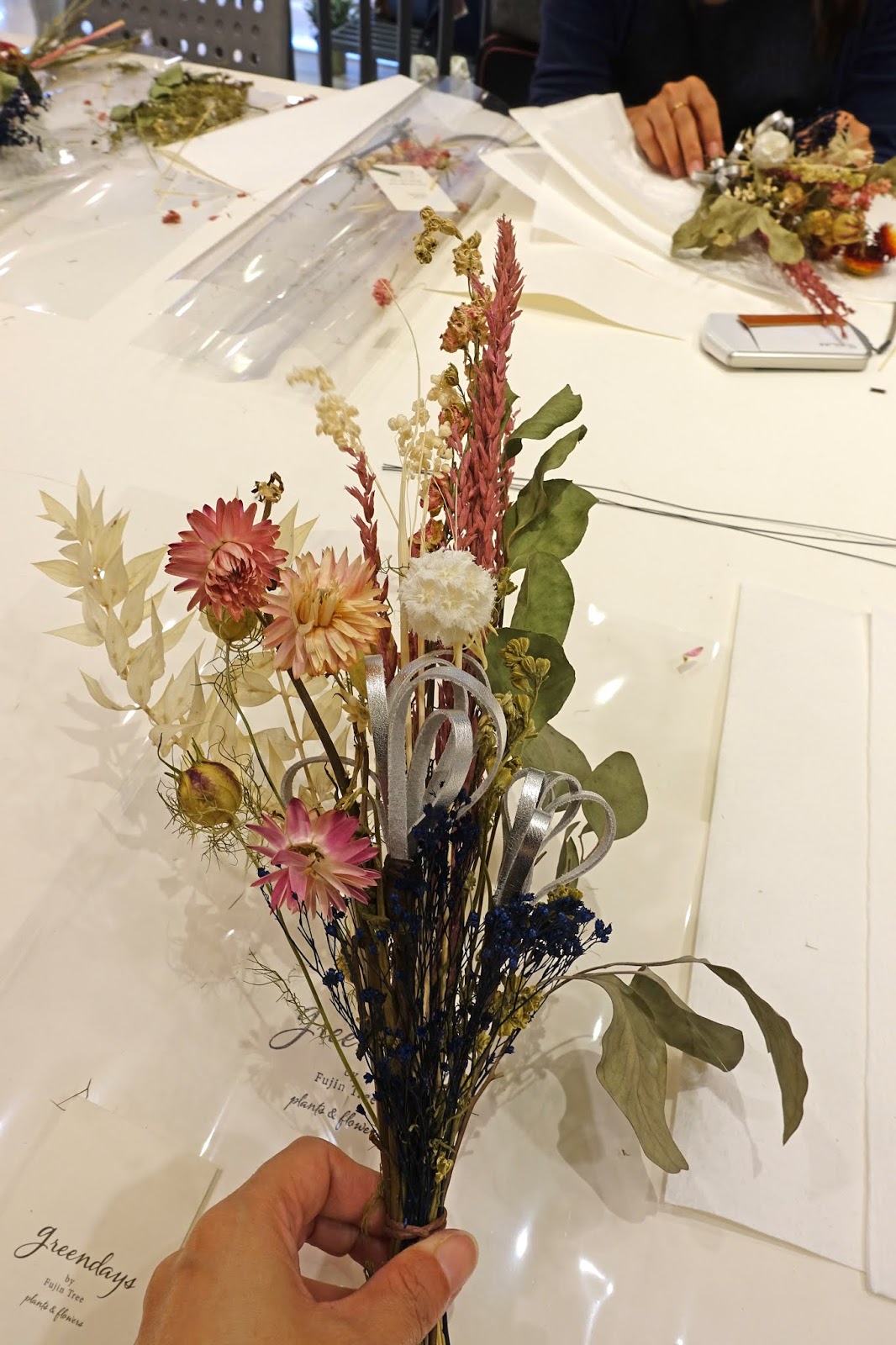 看了一圈包包,準備開始上花藝課,來自greendays的花藝老師,親切可掬的教我們辨識花材、整理花材、將花束的層次裡出來,然後綁成一束捧花,過程非常有意思,讓我上完這堂,還會想再去greendays上課。