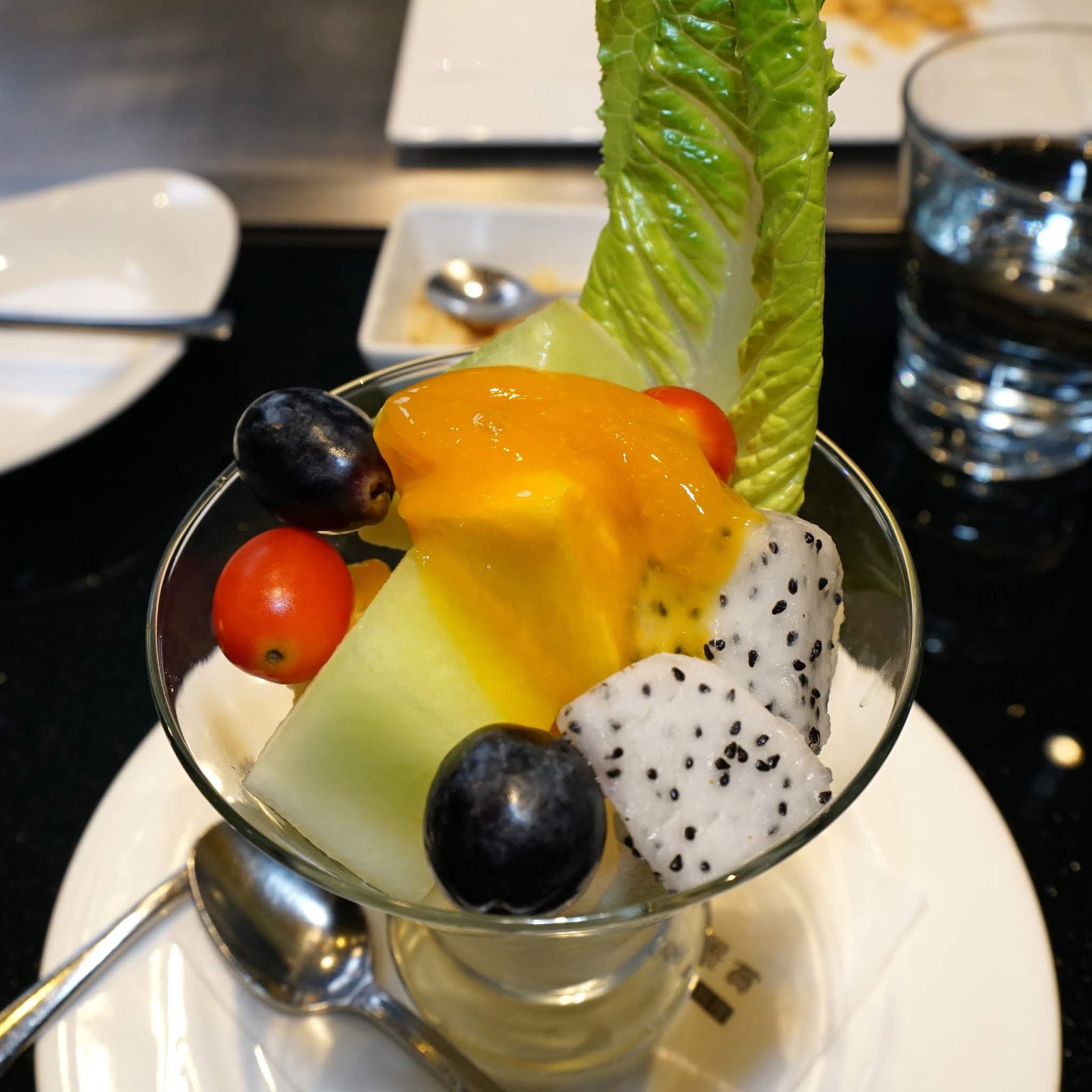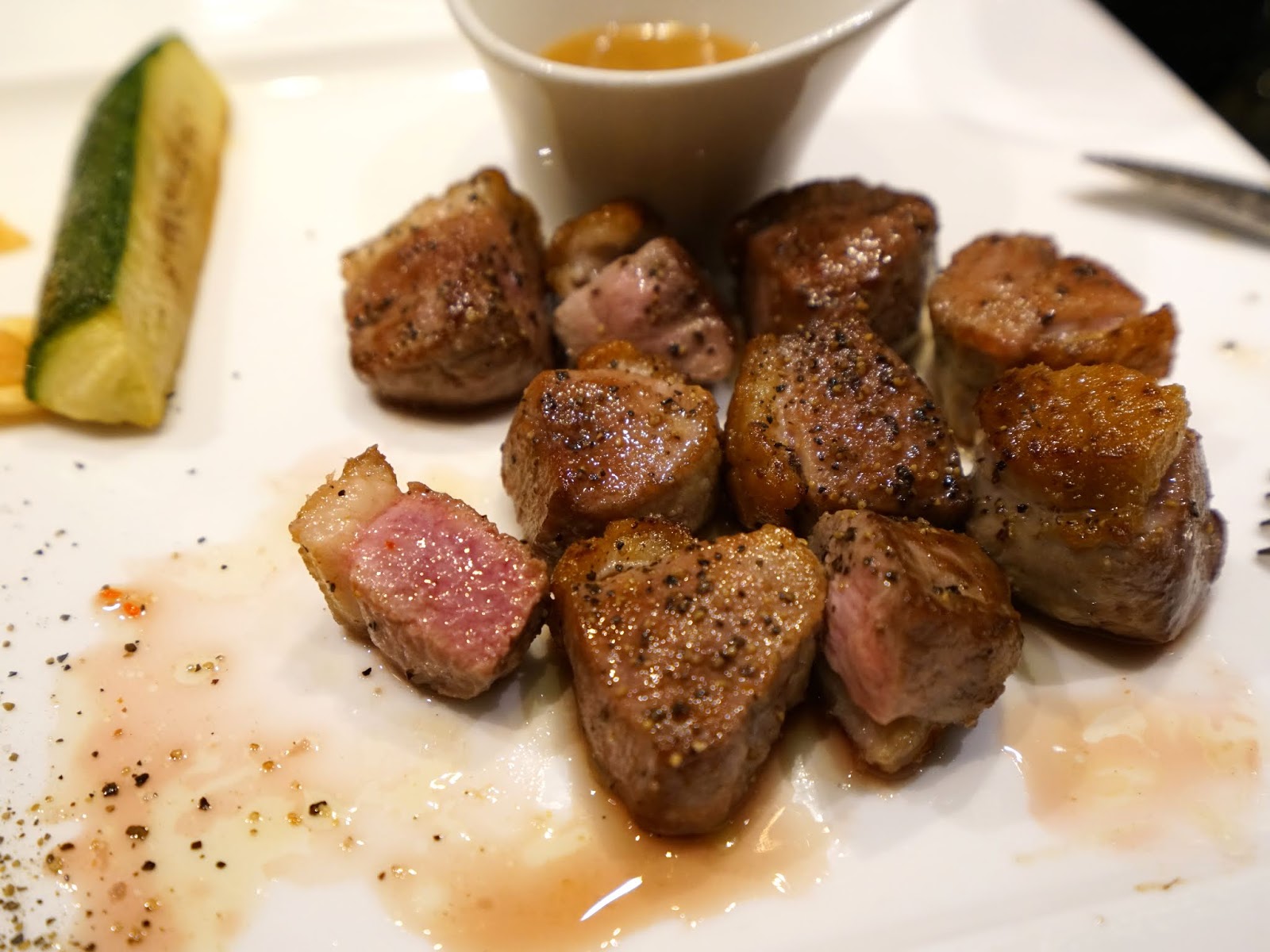 白蘭地櫻桃鴨胸是墨賞的招牌菜,這道菜的做法繁複,而且還可以看在鐵板上的火焰表演,讓這頓飯越吃越精彩,以白蘭地酒包覆點火去煎,讓白蘭地的香氣與鴨胸融合,吃起來鮮嫩多汁!