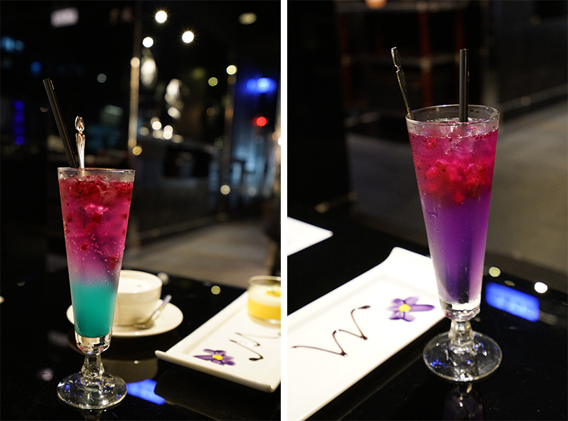 特別招待的藍柑橘檸檬沙瓦,襯著夜色,夢幻的兩層顏色看起來超美,看起來很像調酒卻沒有酒精,要喝的時候攪拌底下的糖漿,整杯就會變成紫色的,喝起來有著檸檬滋味的小清新。
