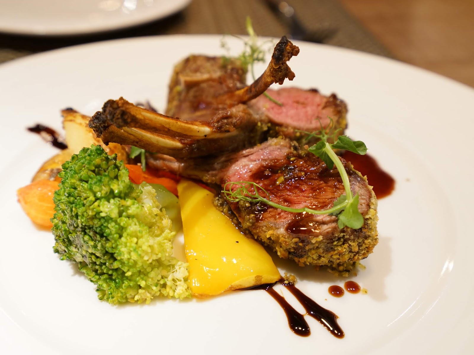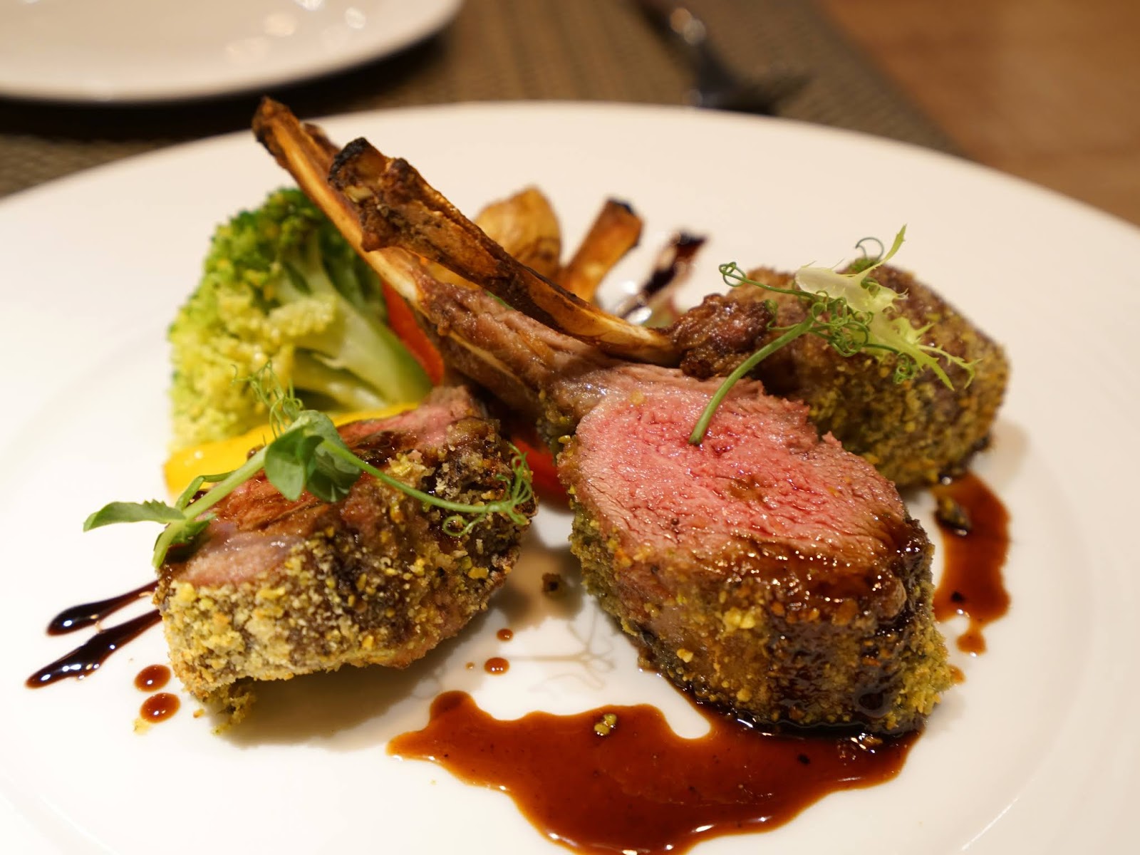 青醬開心果烤羊小排一上桌就讓我們驚豔,不但視覺上非常美,羊排的熟度也烤得剛好,厚度切得夠厚,羊排的肉質嘗起來柔軟多汁,加上青醬開心果醬料的提味,帶著微甜的薄荷香氣,完全是歐陸料理的滋味,做得非常道地!
