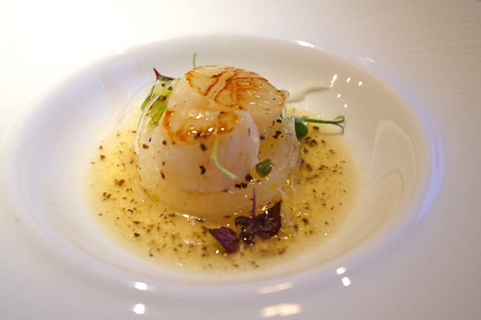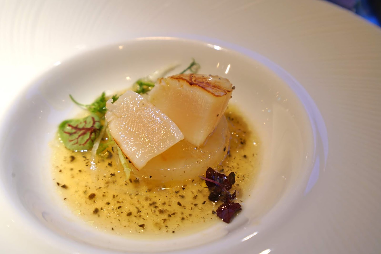 我們分別選擇了香煎北海道干貝佐松露高湯和煙燻鮭魚凱薩沙拉,碩大的干貝還給了一個半,份量令人心滿意足。