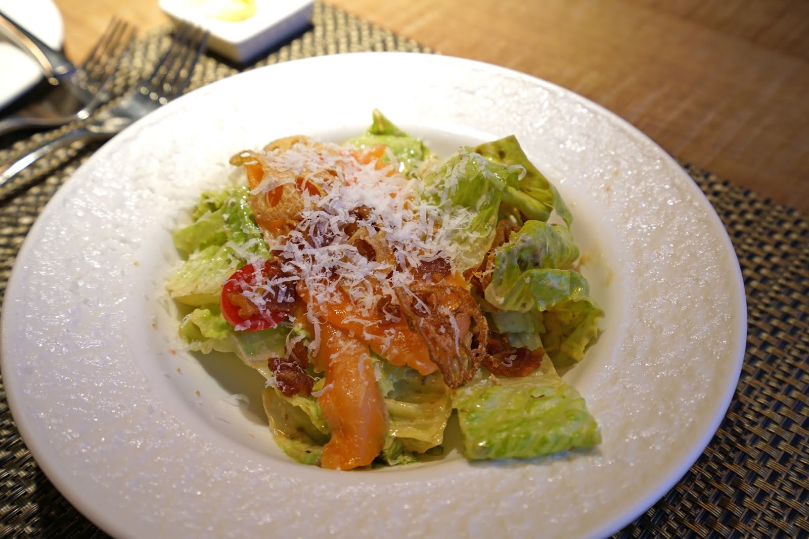 這份煙燻鮭魚凱薩沙拉質感極佳,煙燻鮭魚吃起來溫度適中不會過於冰冷,青嫩甜脆的蘿蔓萵苣一吃就知道很新鮮,佐著煎得脆脆的培根與乾蓮藕片、新鮮小番茄,口感層次很多元,醬汁下得剛剛好,讓細刨起司提味,成就這盤滋味豐饒的沙拉!