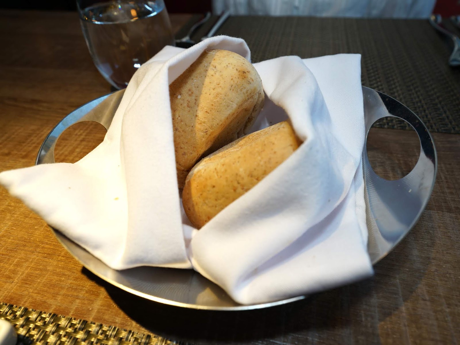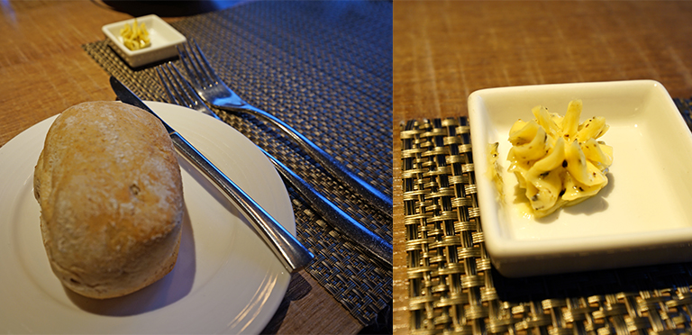 確認餐點後,先送上烤得溫熱的法式手工麵包,抹上特製的松露奶油讓麵包的香氣更豐富,口感鬆軟帶著松露的香氣,要不是接下來還有好多道菜,我還真想續麵包。